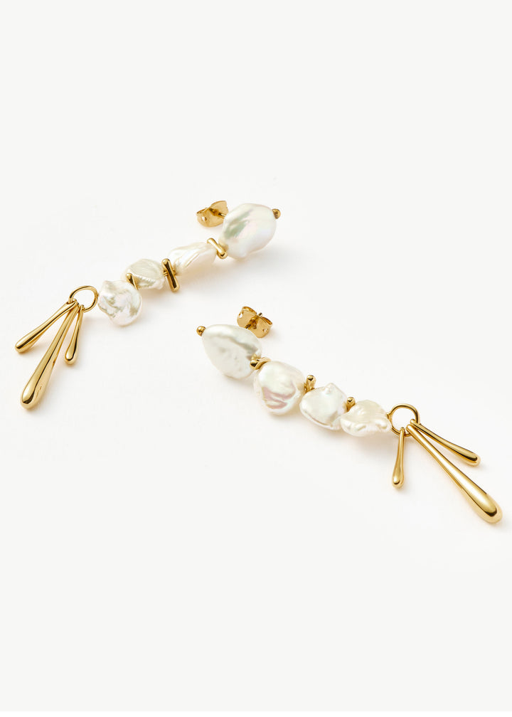 These Keshi pearl drop earrings by Missoma are a beautiful tribute to natural, organic beauty. The 18kt gold-plated drop earrings feature unique keshi pearls, each with its own individual shape and luster. The sculpted design complements the pearls perfectly, creating a sense of free-spirited elegance and refined charm. They symbolize a love for the unique and a celebration of nature's artistry.