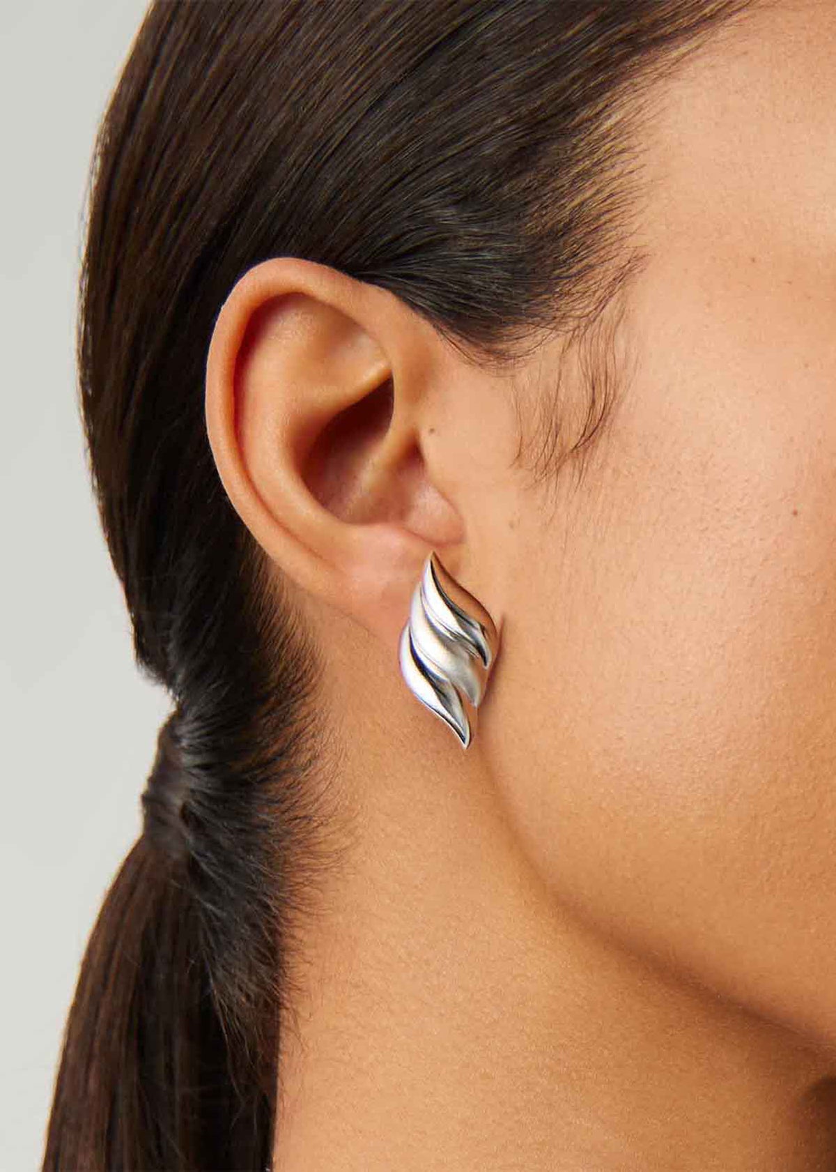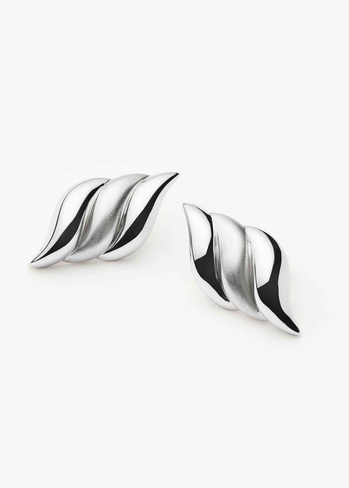 These studs are crafted from rhodium-plated brass with a sculpted ridged design. The stud dimensions are 3cm x 1.5cm, and they are secured with a post fastening.