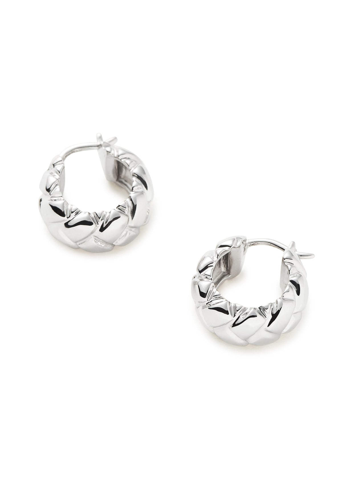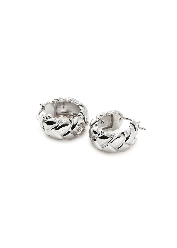 These hoops are crafted from rhodium-plated sterling silver with a textured design. The total drop is 1.4cm, and they are secured with a sleeper fastening.