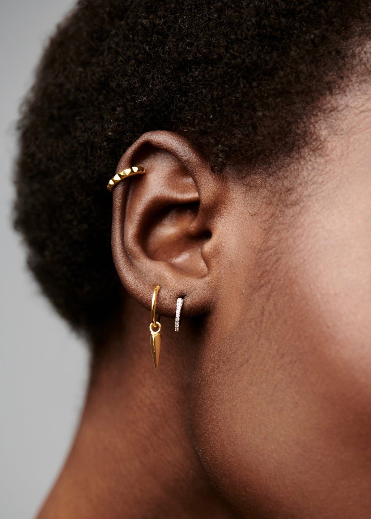 These hoops are crafted from 18kt gold vermeil with crystal embellishments. The total drop is 1cm, and they are secured with a sleeper fastening. They are presented in a designer-stamped box.