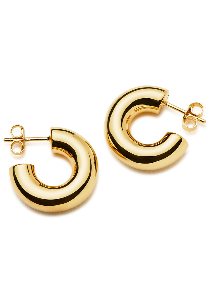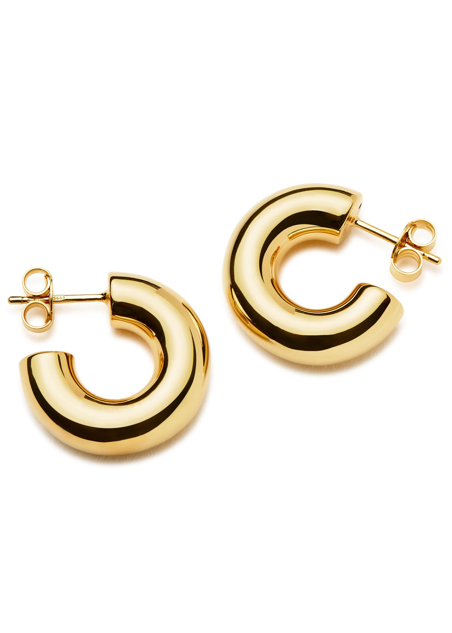These hoops are crafted from 18kt gold vermeil on sterling silver. The diameter is 26mm, the thickness is 7mm, and they are secured with a post fastening.