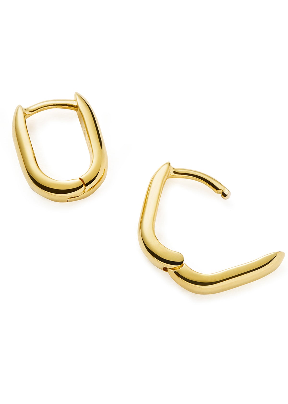 These hoops are crafted from 18kt gold vermeil on sterling silver with a unique ovate shape. The dimensions are 11.2mm x 8.6mm, and they are secured with a sleeper fastening.
