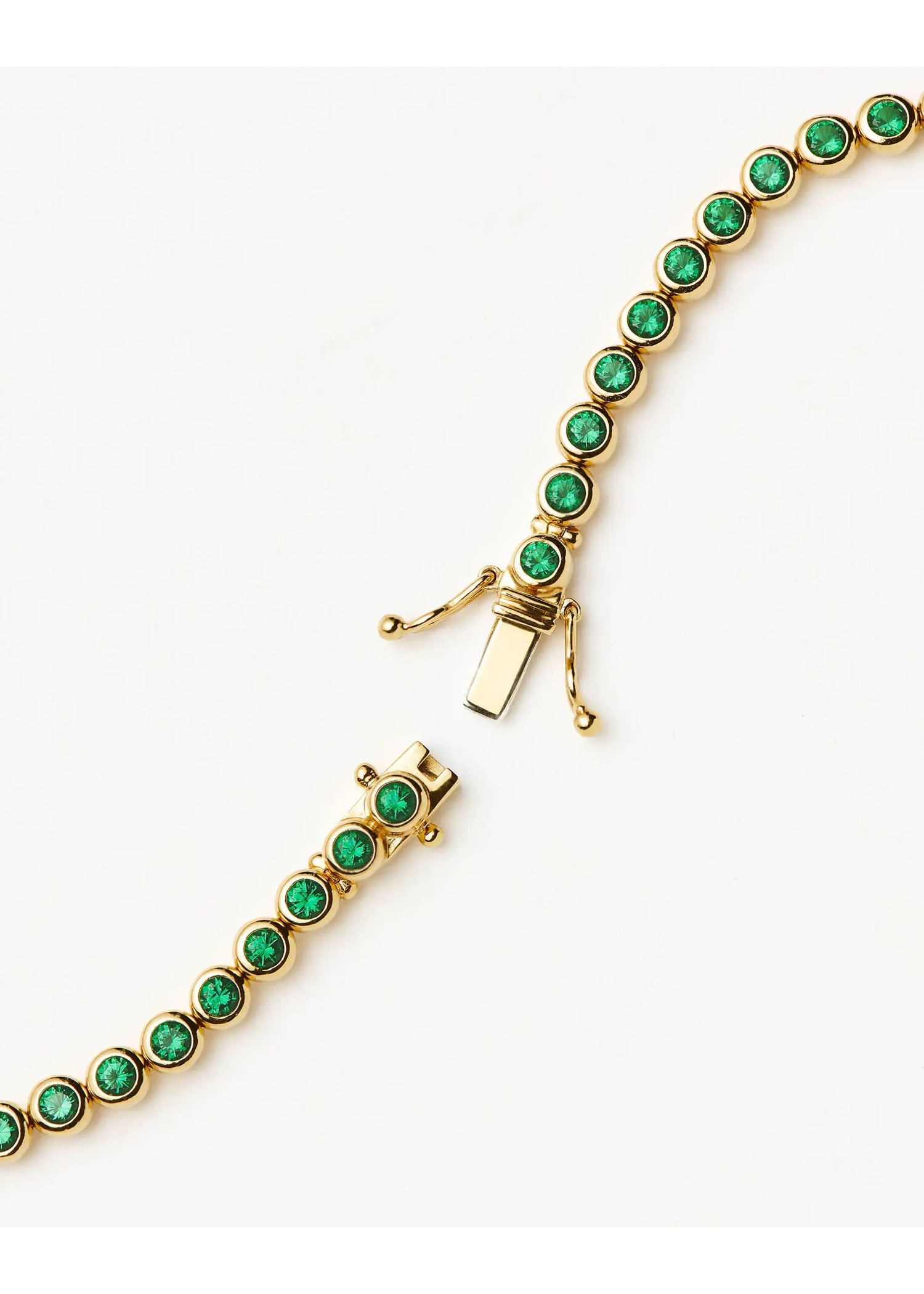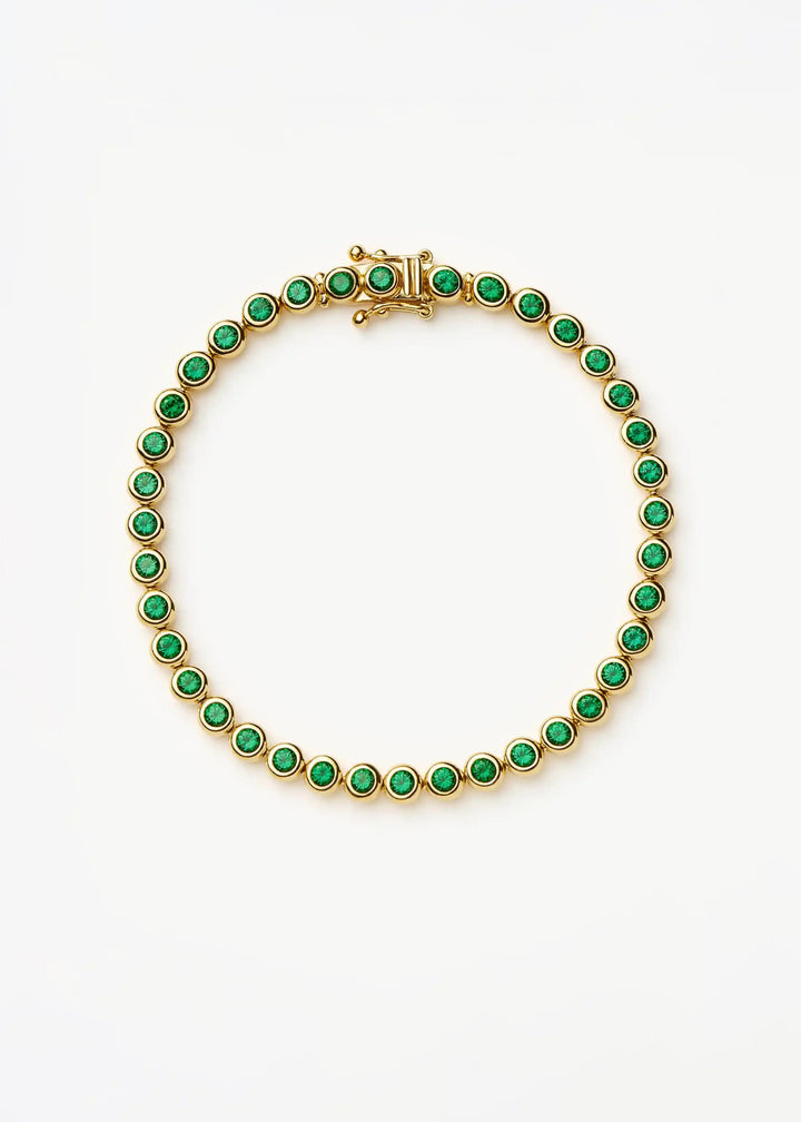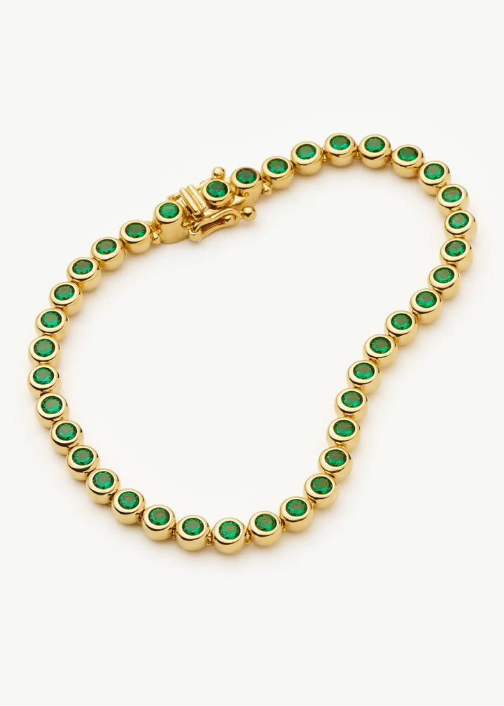 This Tennis round bracelet by Missoma is a luxurious and vibrant statement. The bracelet is meticulously adorned with brilliant emerald green nano-crystals, creating a continuous circle of stunning color. This piece is perfect for adding a touch of sophisticated glamour to your wrist, symbolizing enduring beauty and a love for bold, rich color.