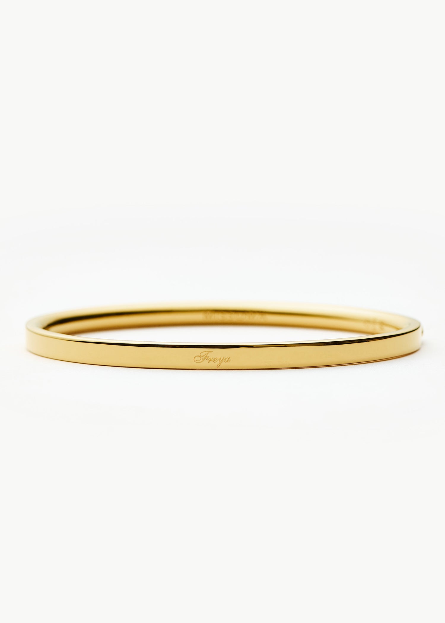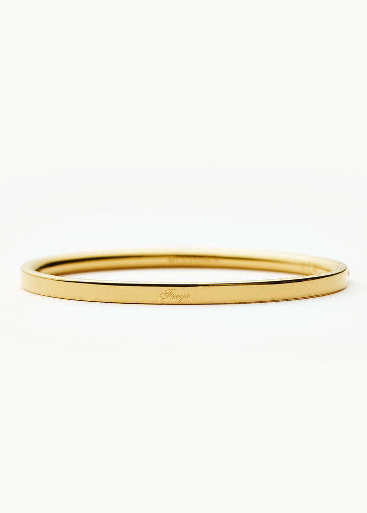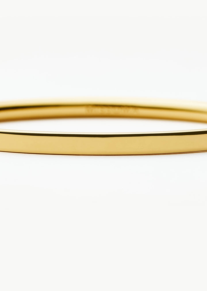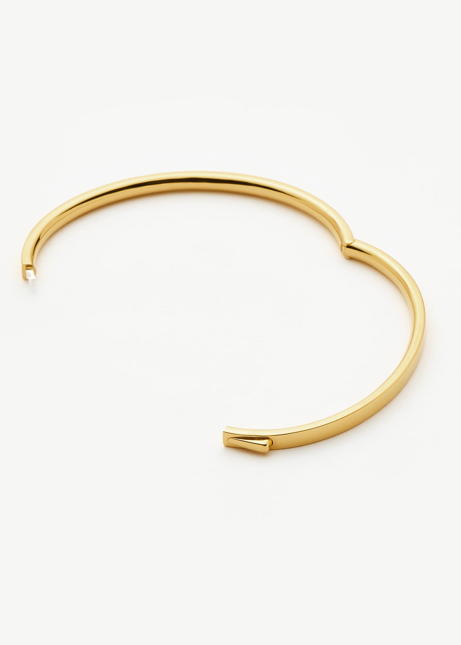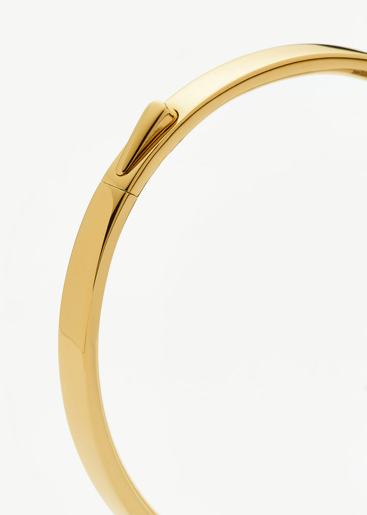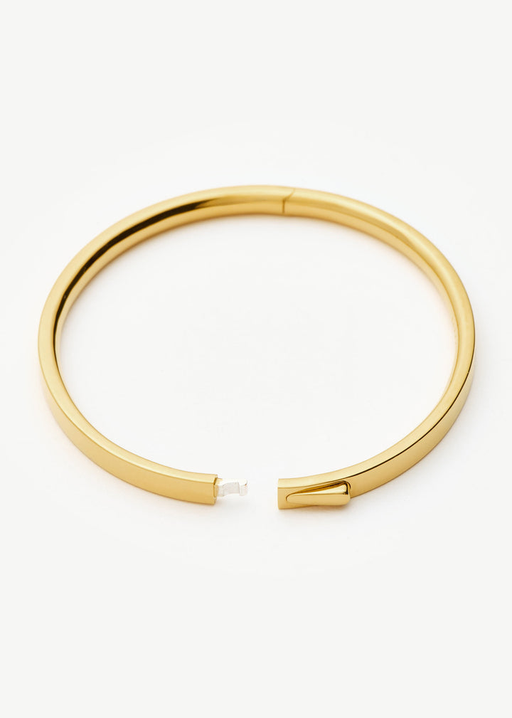 This bangle is crafted from 18kt gold vermeil. The widest point is 0.62cm, and it features a hinged design.