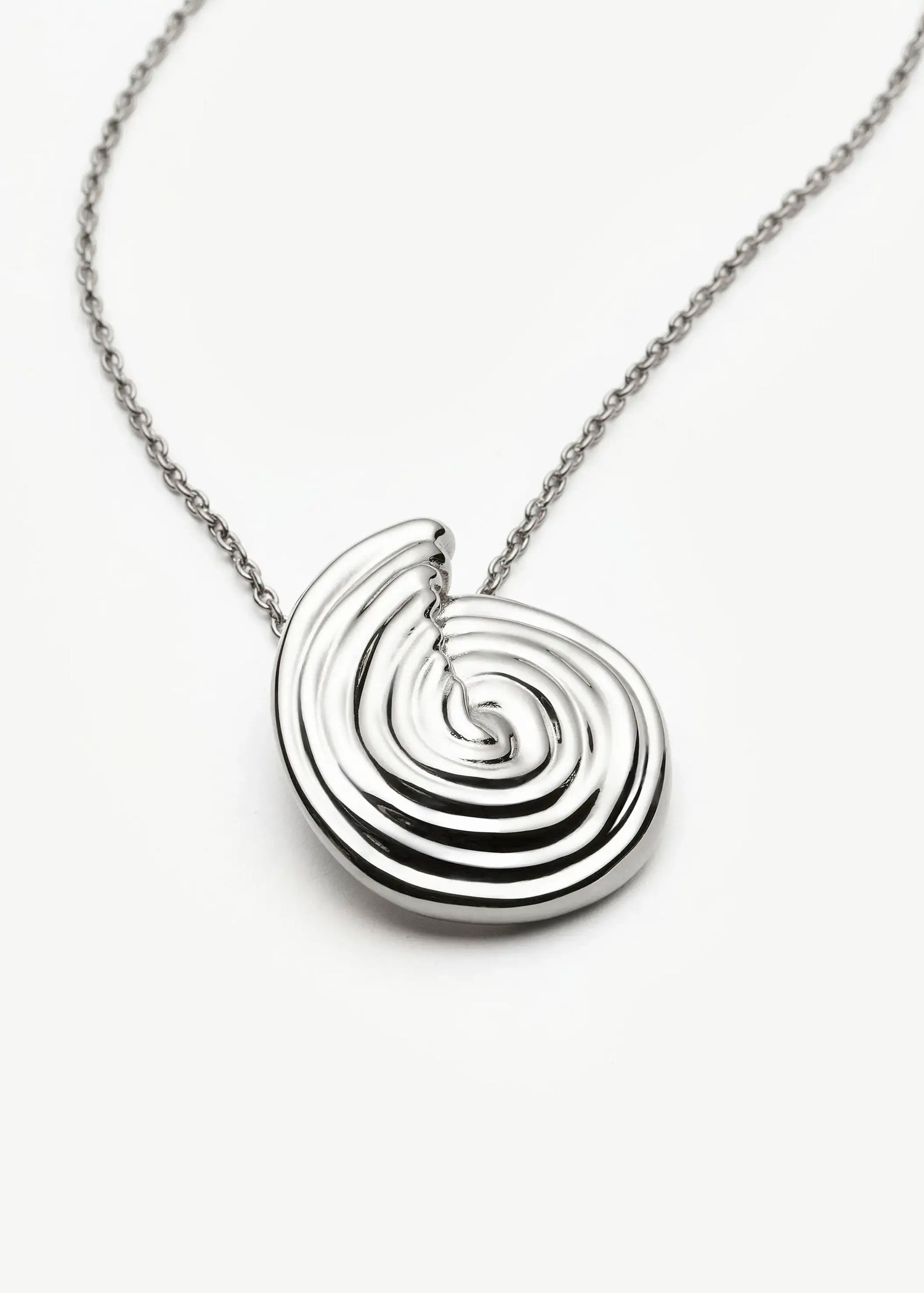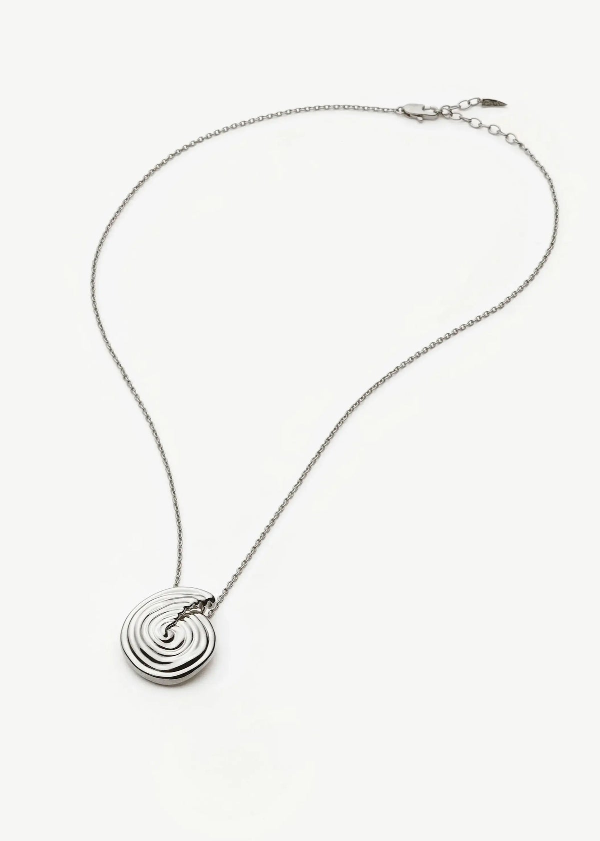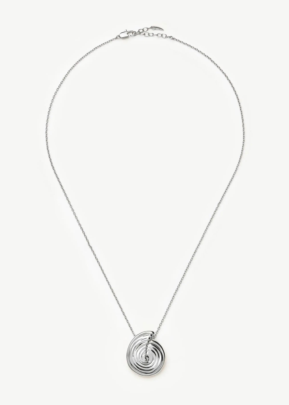 This necklace is crafted from rhodium-plated brass with a sculpted spiral pendant. The adjustable length is 46cm to 50cm, and it is secured with a lobster-clasp fastening.
