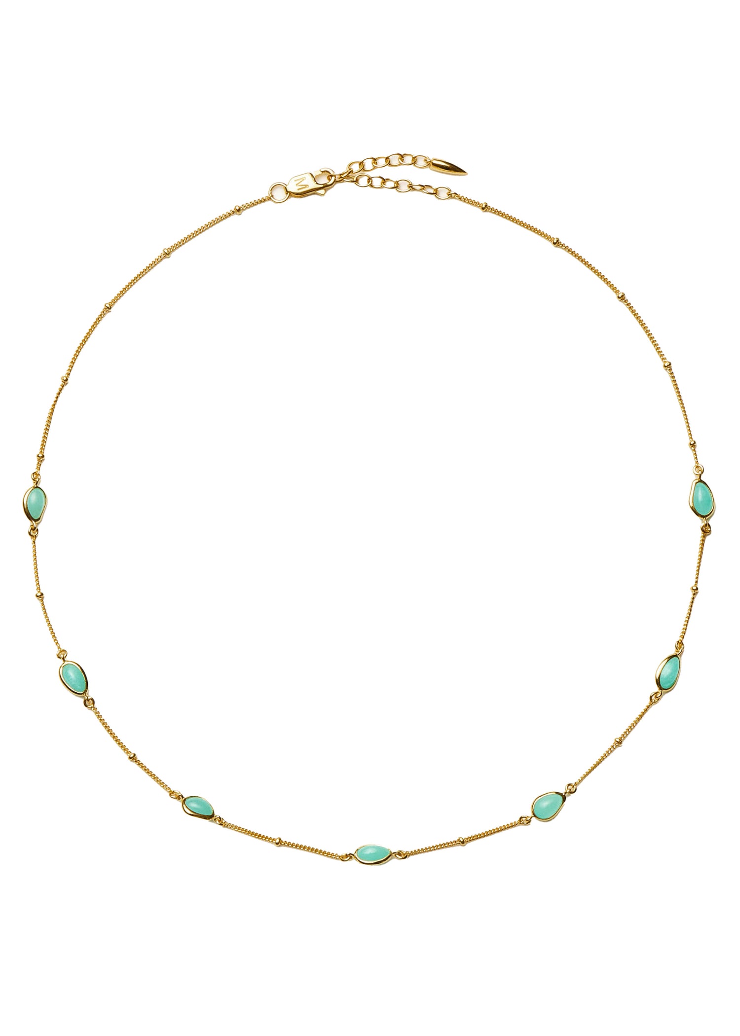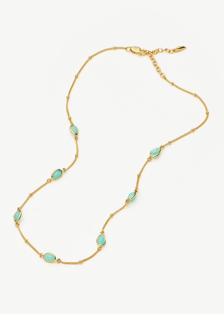 This choker is crafted from 18kt gold vermeil with malachite stone embellishments. The pendant measures 0.74cm x 0.49cm, and the adjustable chain length is 38cm - 42cm. It is secured with an adjustable lobster-clasp fastening.