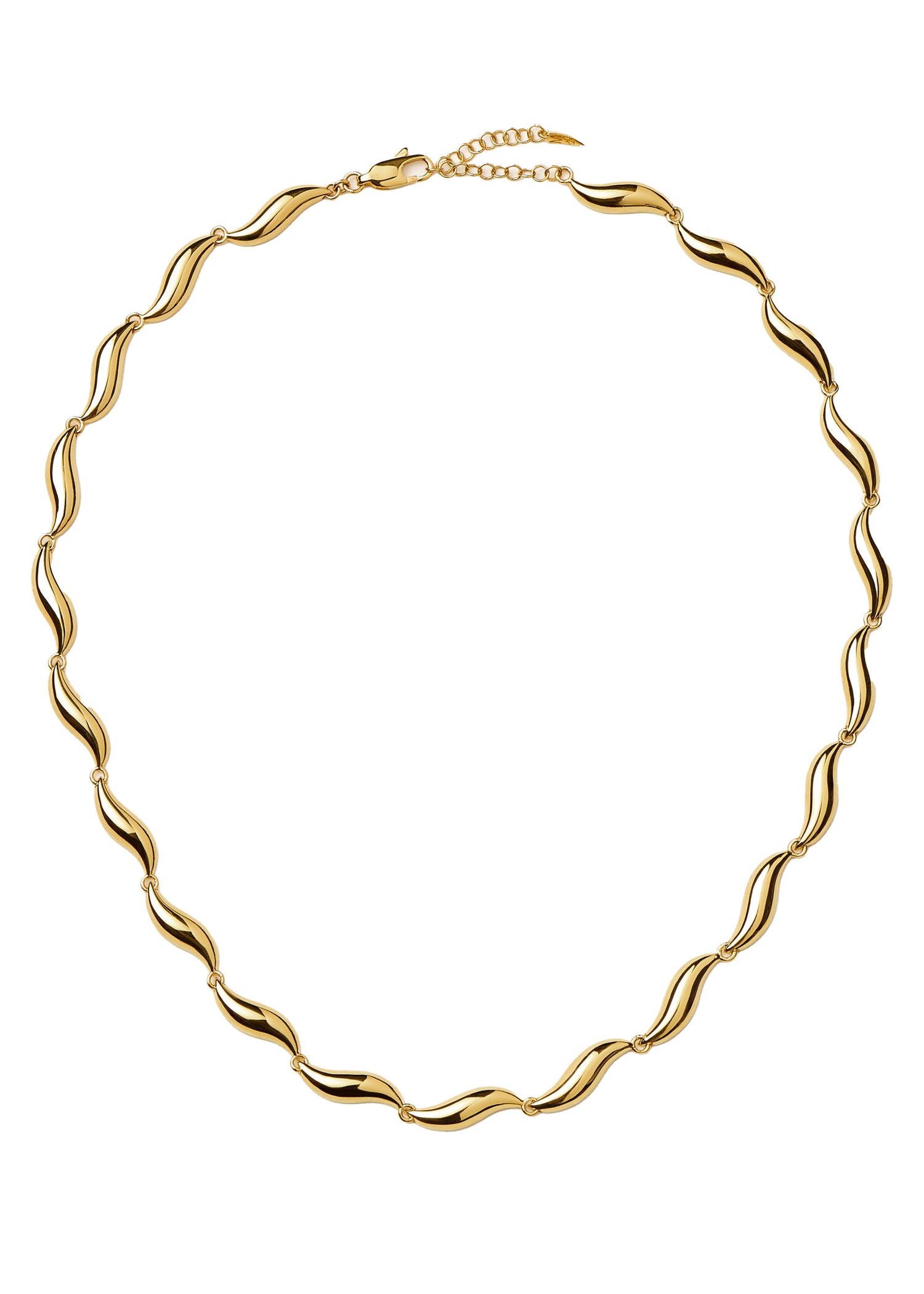 This necklace is crafted from 18kt gold-plated brass with a curved S chain design. The adjustable length is 41cm - 45cm, and it is secured with an adjustable clasp fastening.