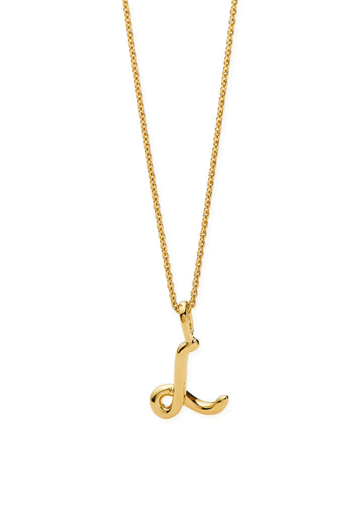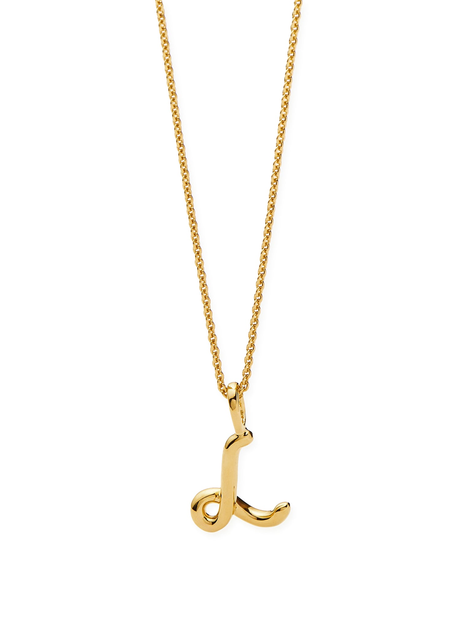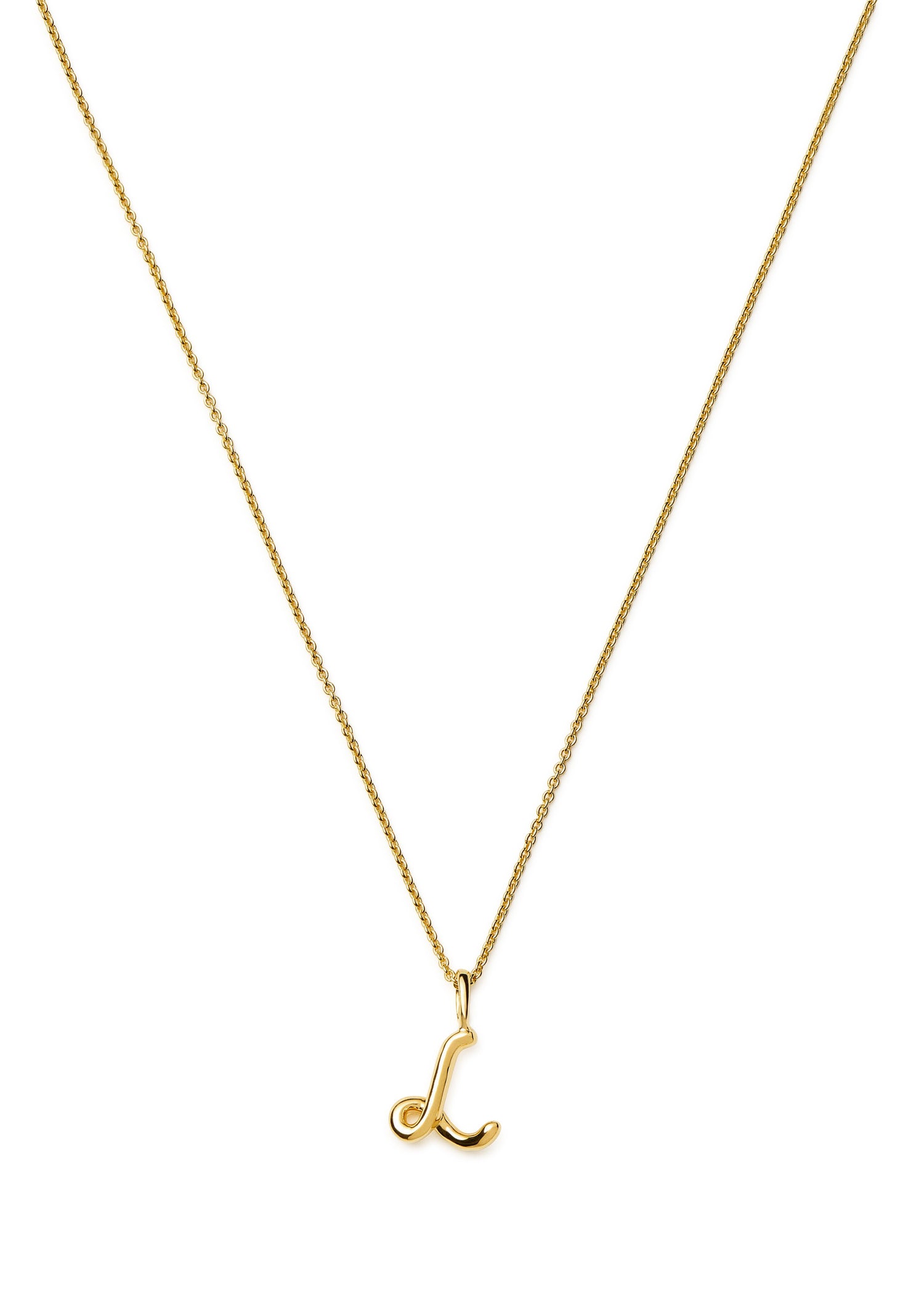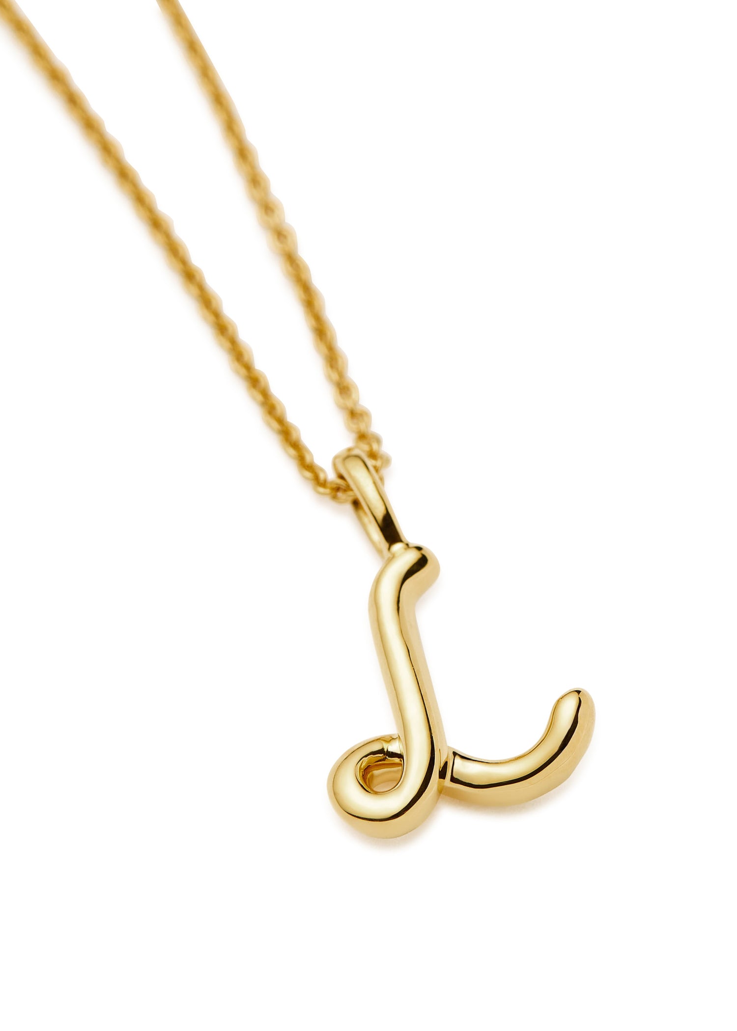 This necklace is crafted from recycled 18kt gold vermeil on recycled sterling silver with an L initial pendant. The length is 45cm, the pendant measures 1.2cm x 1.1cm, and it is secured with an adjustable lobster clasp fastening.