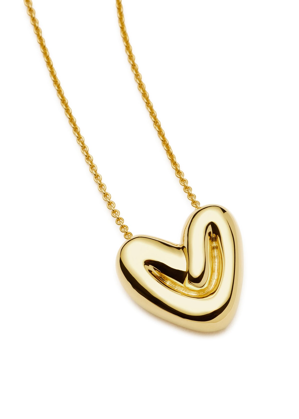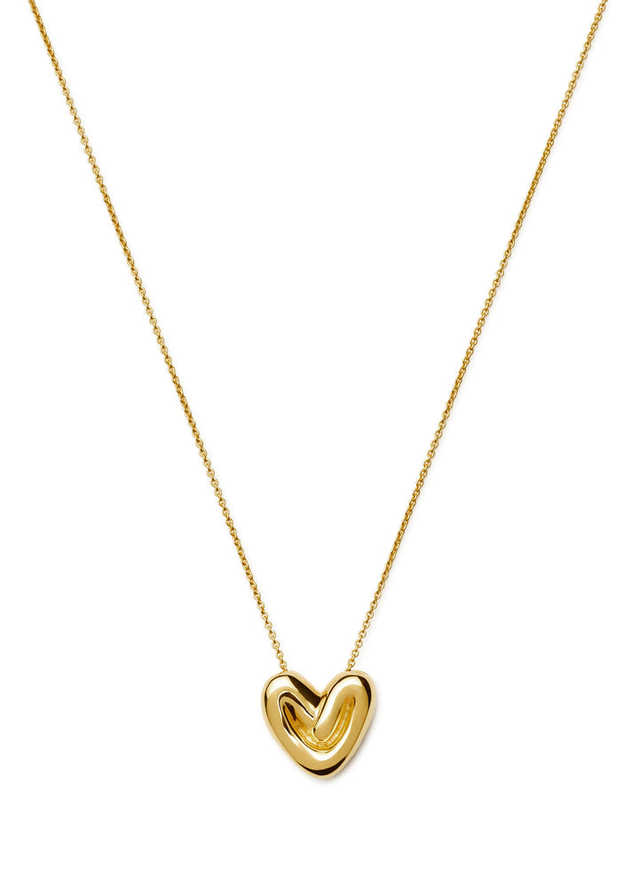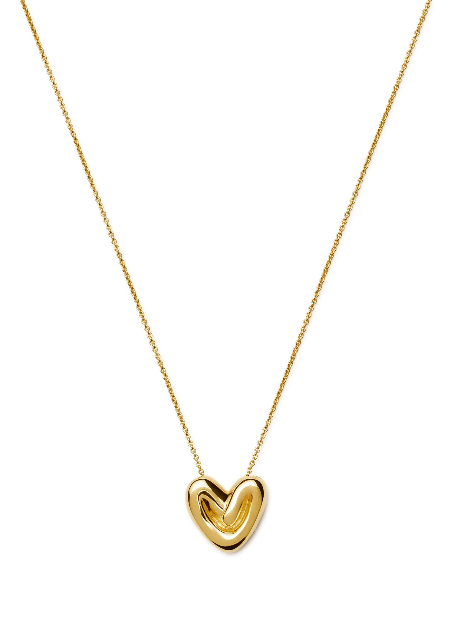 This necklace is crafted from 18kt gold-plated brass with a sculpted heart pendant. The length is 45cm, the pendant measures 1.5cm x 1.6cm, and it is secured with an adjustable lobster-clasp fastening.