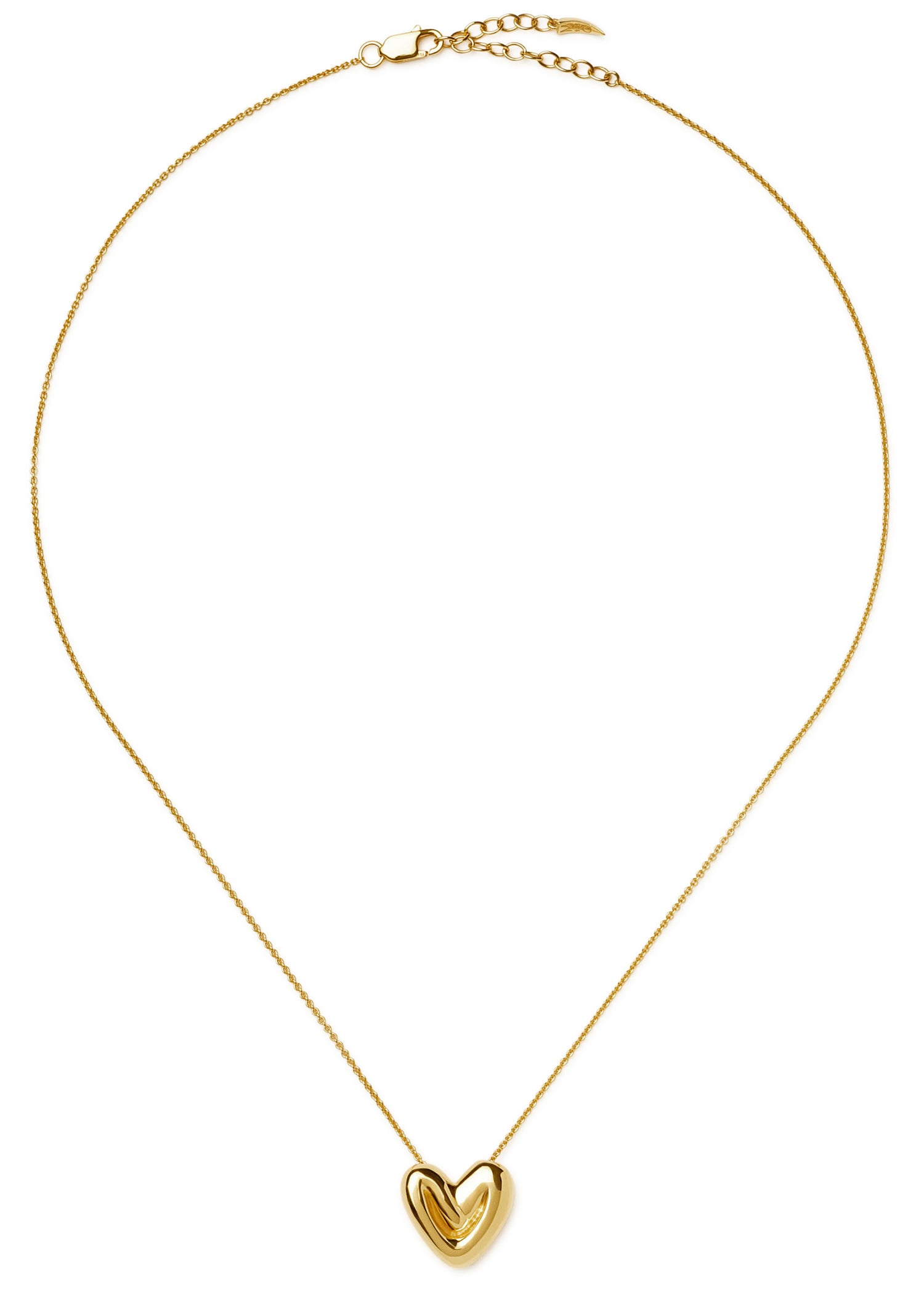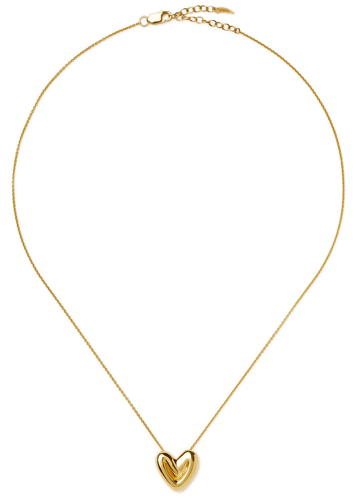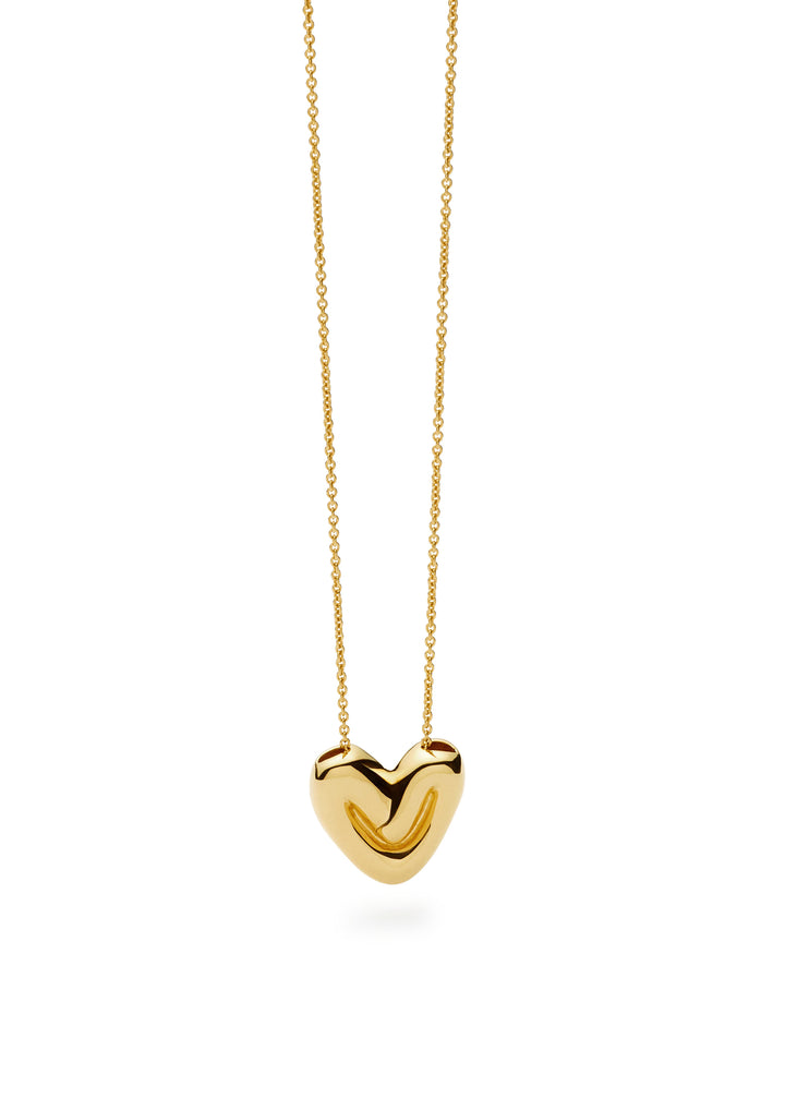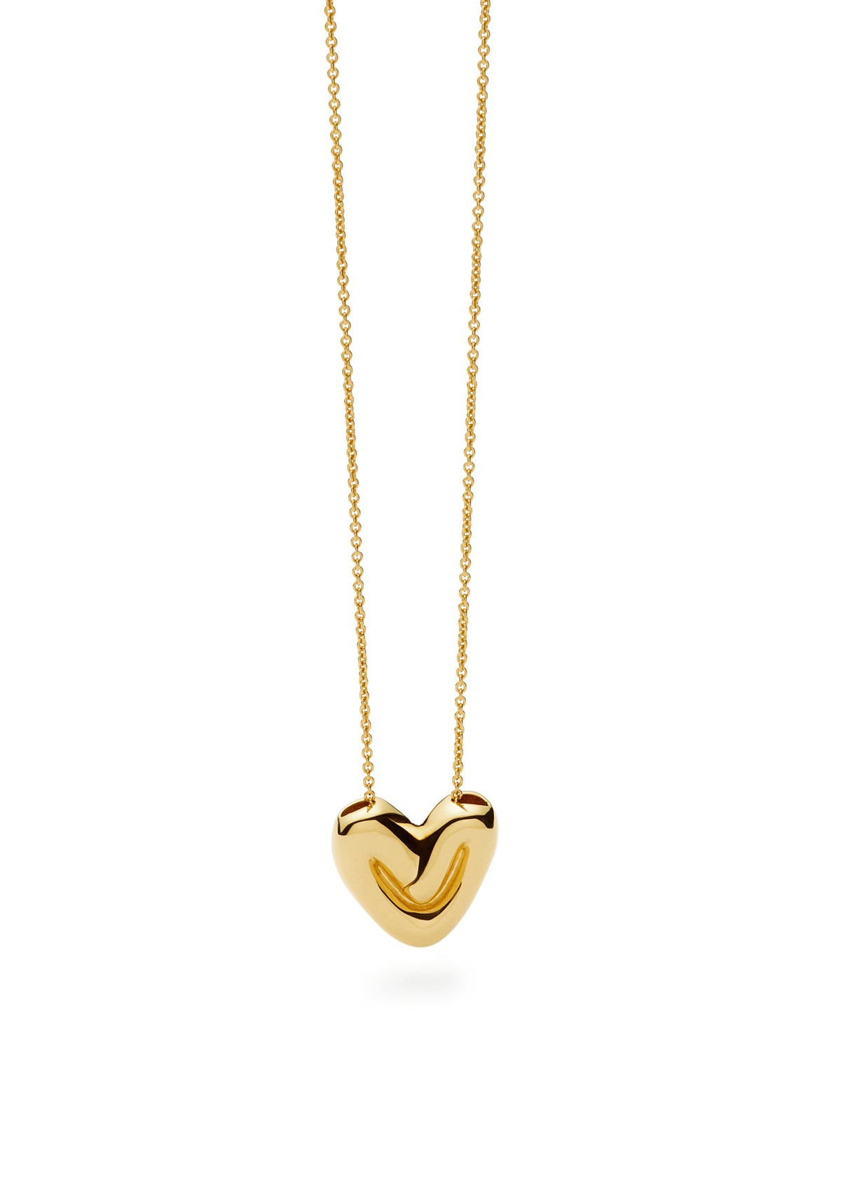 This necklace is crafted from 18kt gold-plated brass with a sculpted heart pendant. The length is 45cm, the pendant measures 1.5cm x 1.6cm, and it is secured with an adjustable lobster-clasp fastening.