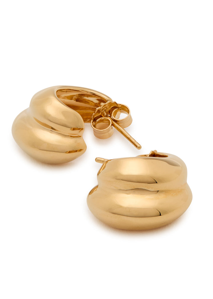 These hoops are crafted from 14kt recycled gold vermeil with a sculpted design. The drop is 1.5cm, and they are secured with a butterfly fastening. They are presented in a designer-stamped pouch.