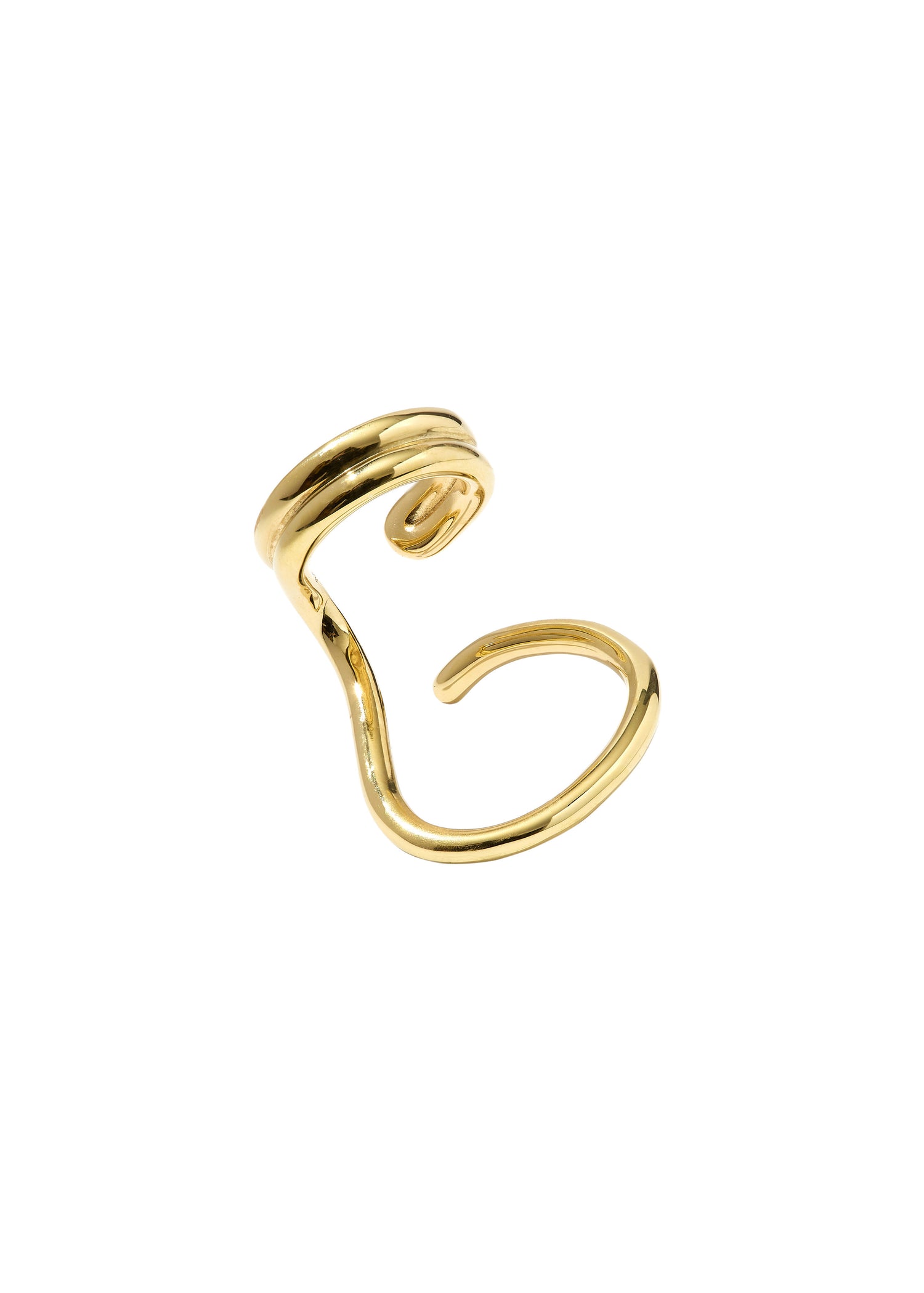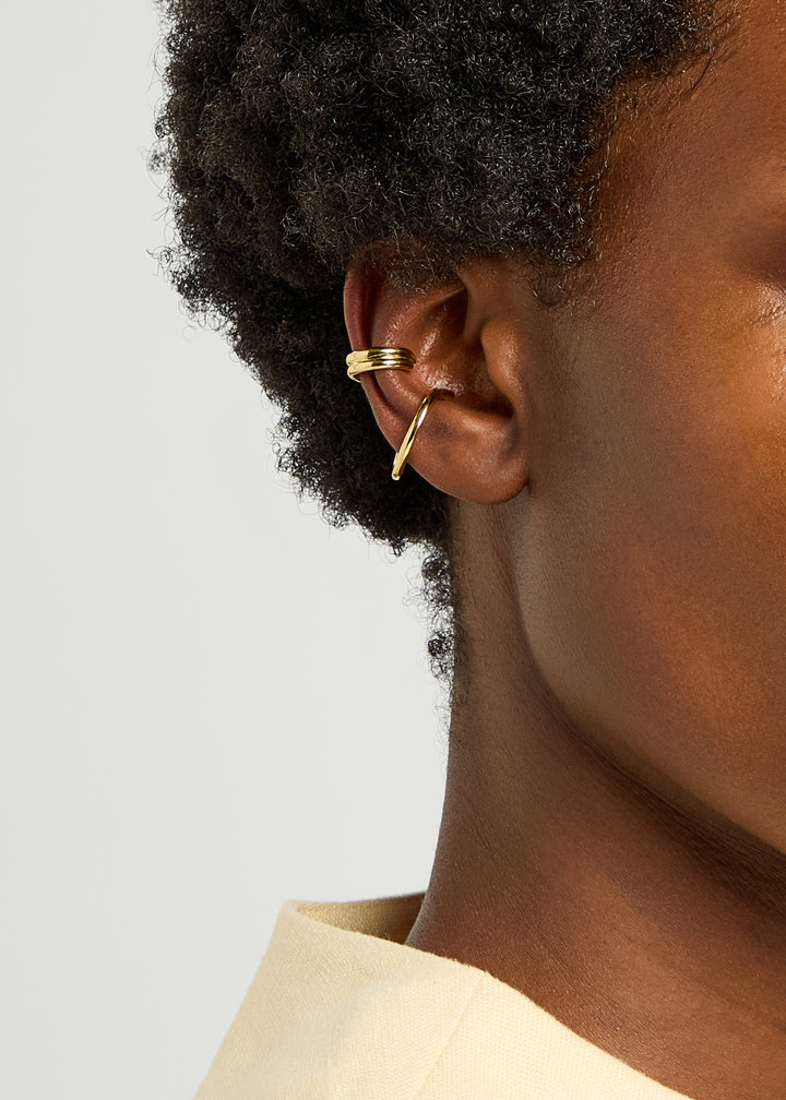 This Sonder 14kt gold vermeil ear cuff by Otiumberg is a bold and sculptural accessory. The hand-finished ear cuff features a unique layered design, which creates a sense of powerful elegance and clean lines. This piece is perfect for adding a touch of architectural artistry and confident style to your ear, symbolizing a love for minimalist yet impactful forms.