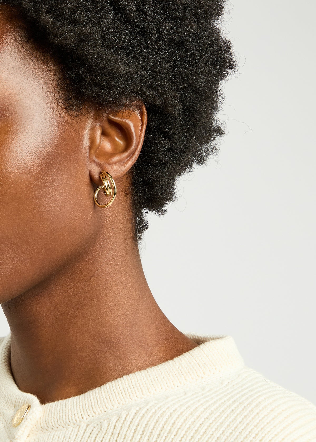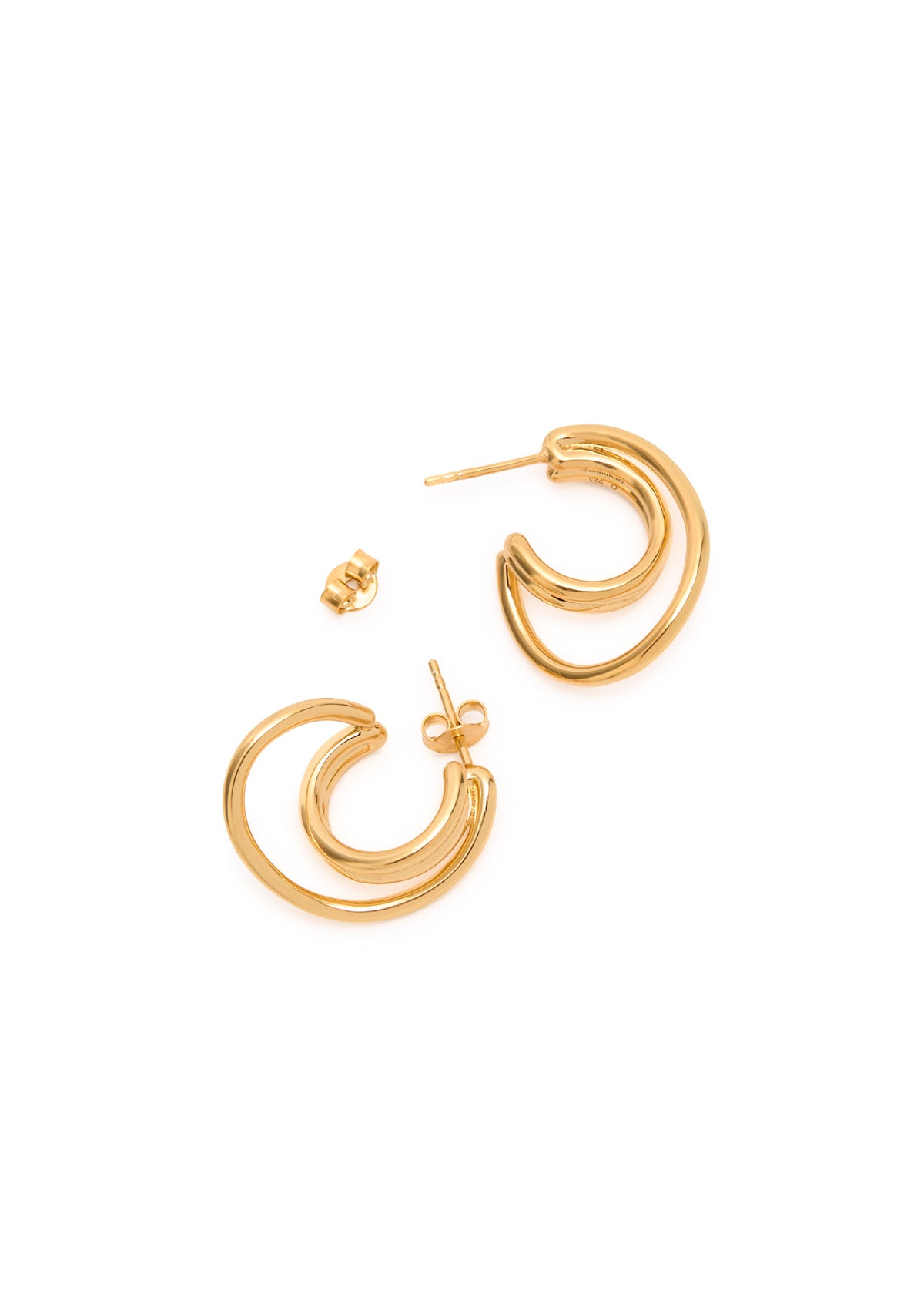 These hoops are crafted from 14kt gold vermeil with a layered design. The drop is 2.2cm, and they are secured with a butterfly fastening. They are presented in a designer-stamped box.