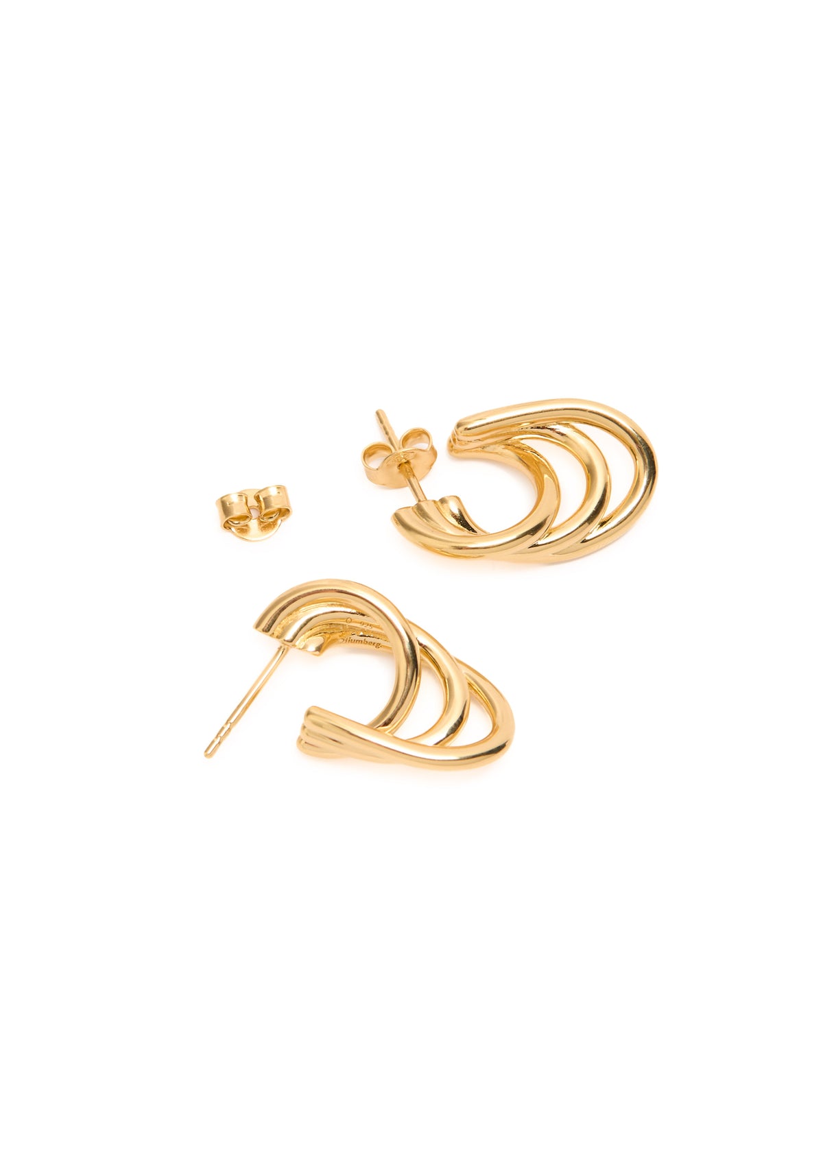 These hoops are crafted from 14kt gold vermeil with a layered design. The drop is 2cm, and they are secured with a butterfly fastening. They are presented in a designer-stamped box.