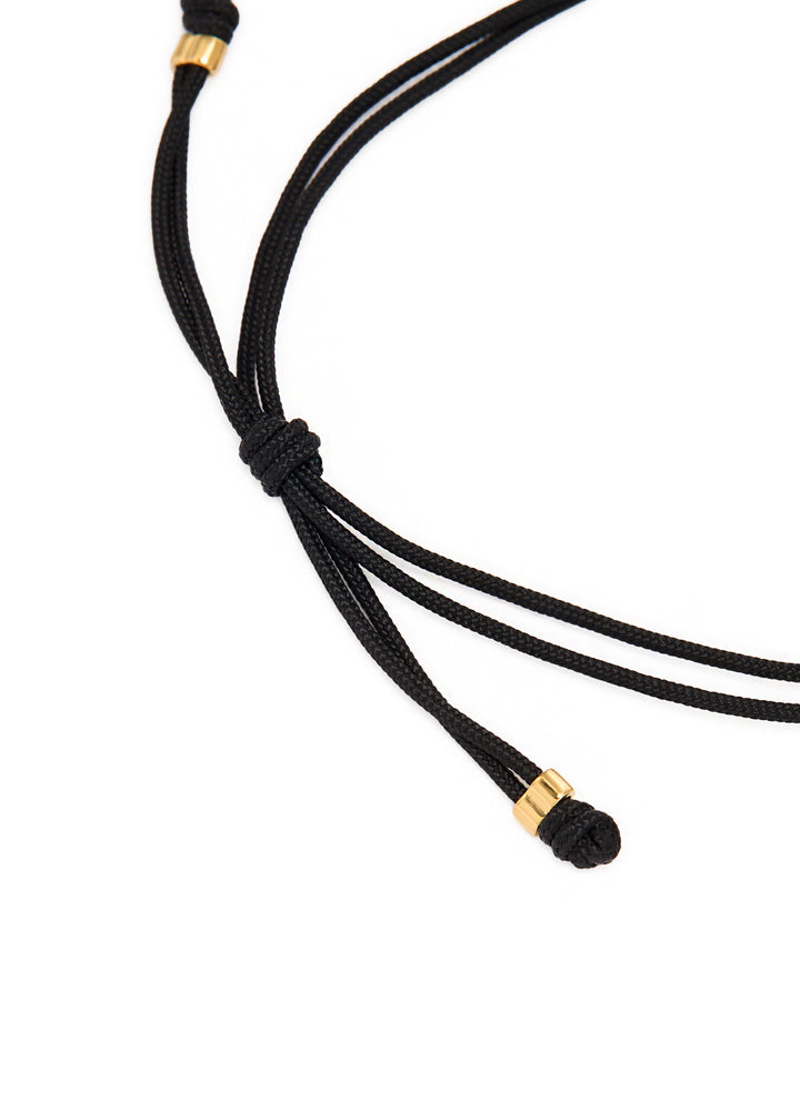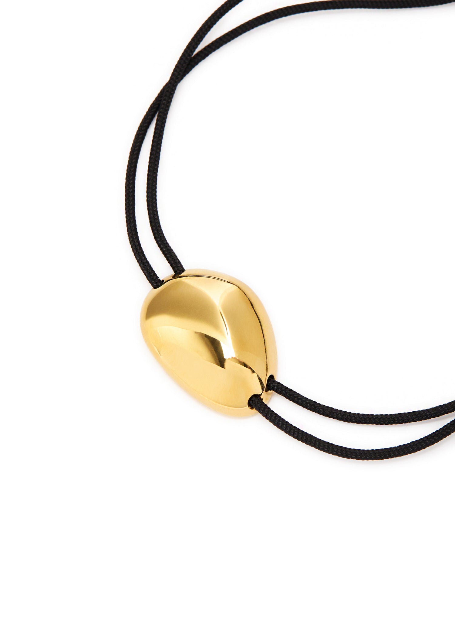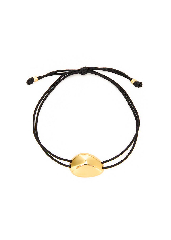 This bracelet is crafted from 14kt gold vermeil and cord with a sculpted oval pendant. The length is 22cm, the pendant measures 1.5cm x 2cm, and it is secured with an adjustable fastening. It is presented in a designer-stamped box.