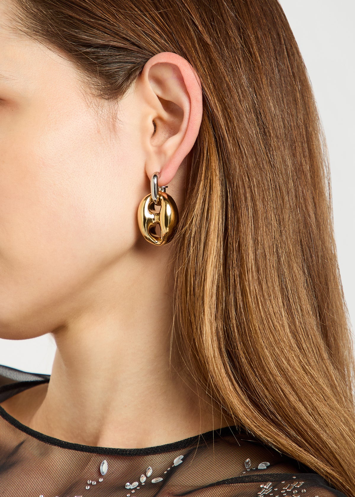 These Two-tone drop earrings by Rabanne are a beautiful fusion of two-toned elegance and modern design. The drop earrings feature a striking anchor chain link pendant that combines both gold and silver-toned metal, creating a dynamic and edgy look. They are perfect for adding a touch of confident, mixed-metal style to your look. They symbolize a harmonious blend of classic and contemporary styles.