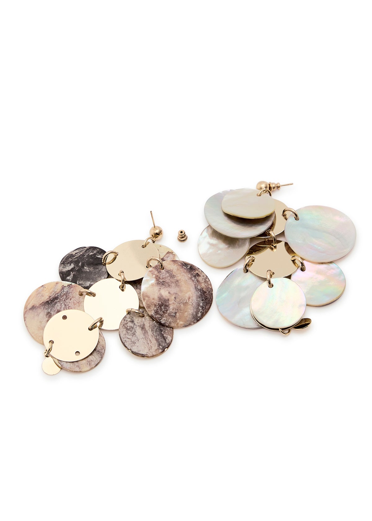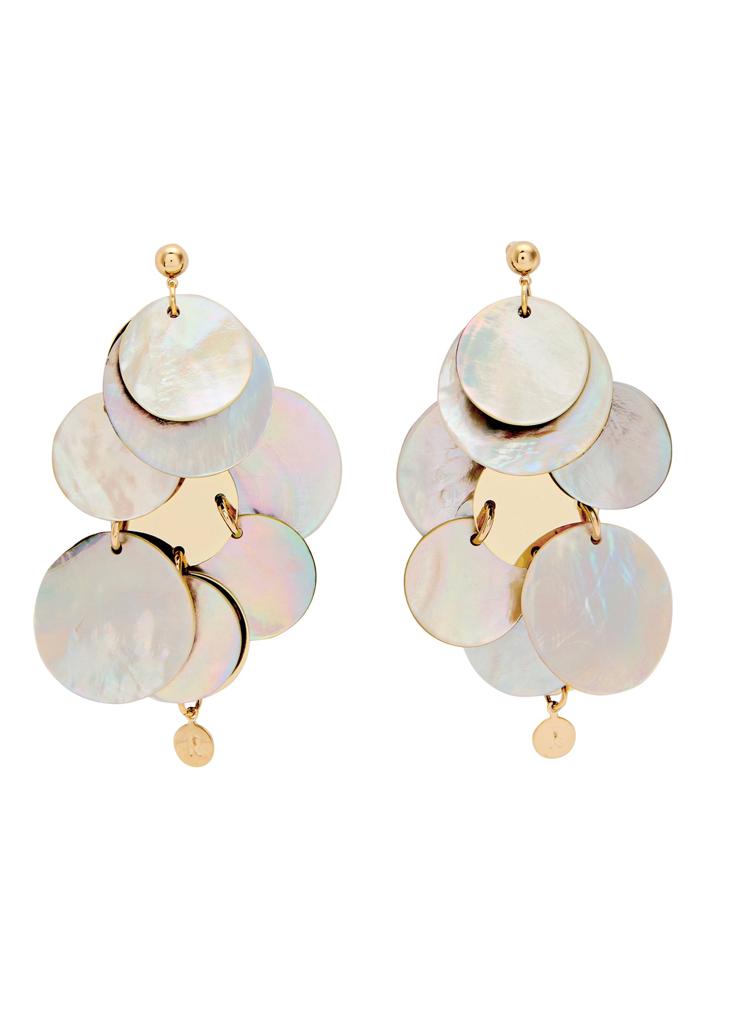 These earrings are crafted from metal with mother-of-pearl charms. The drop is 9cm, and they are secured with a post fastening. They are presented in a designer-stamped box.
