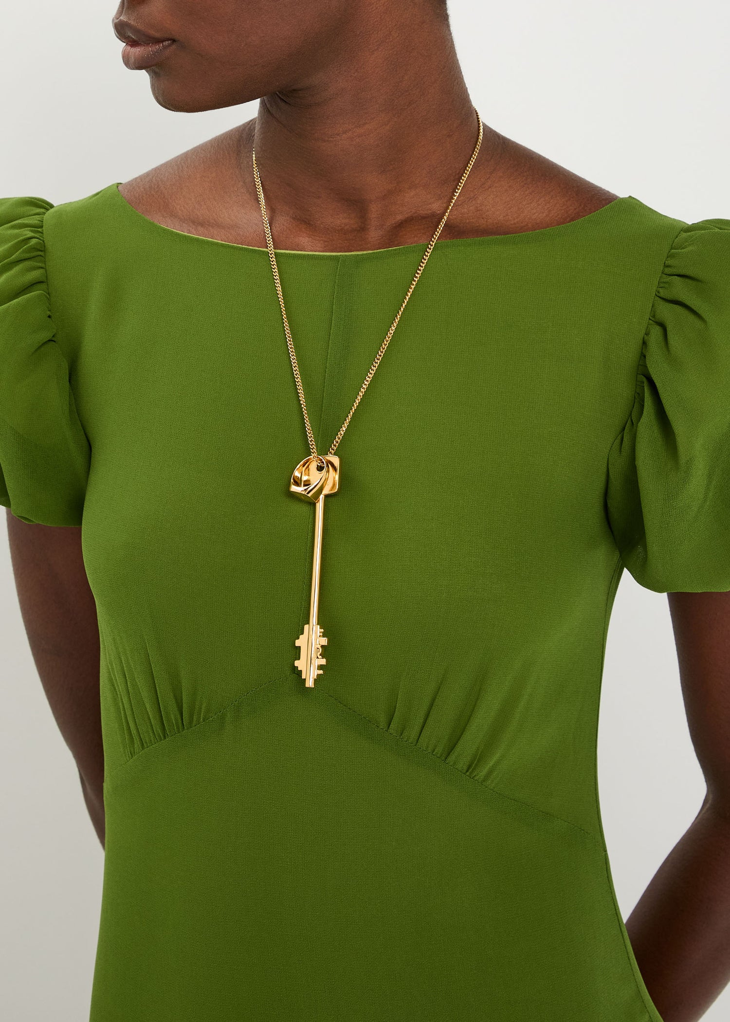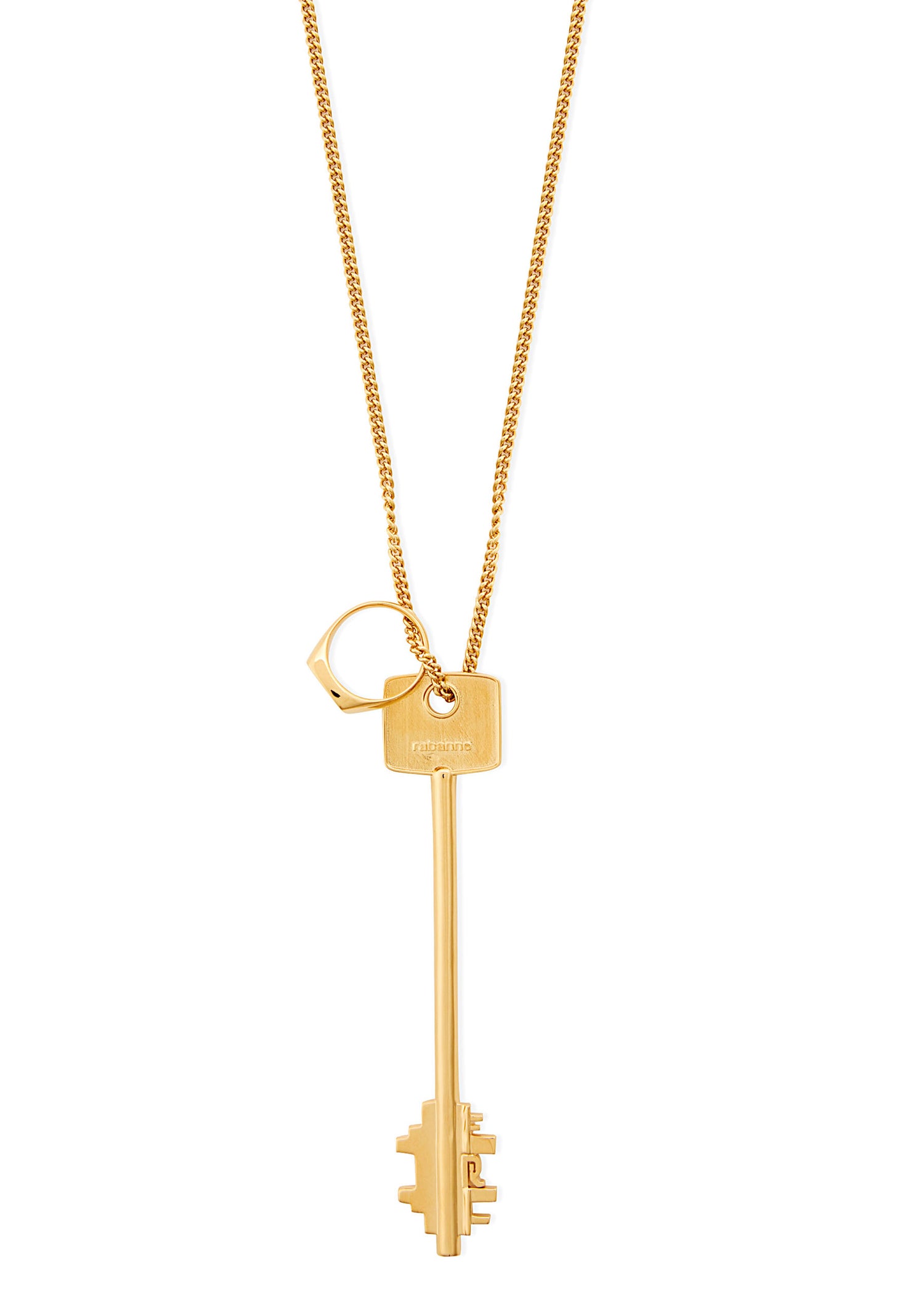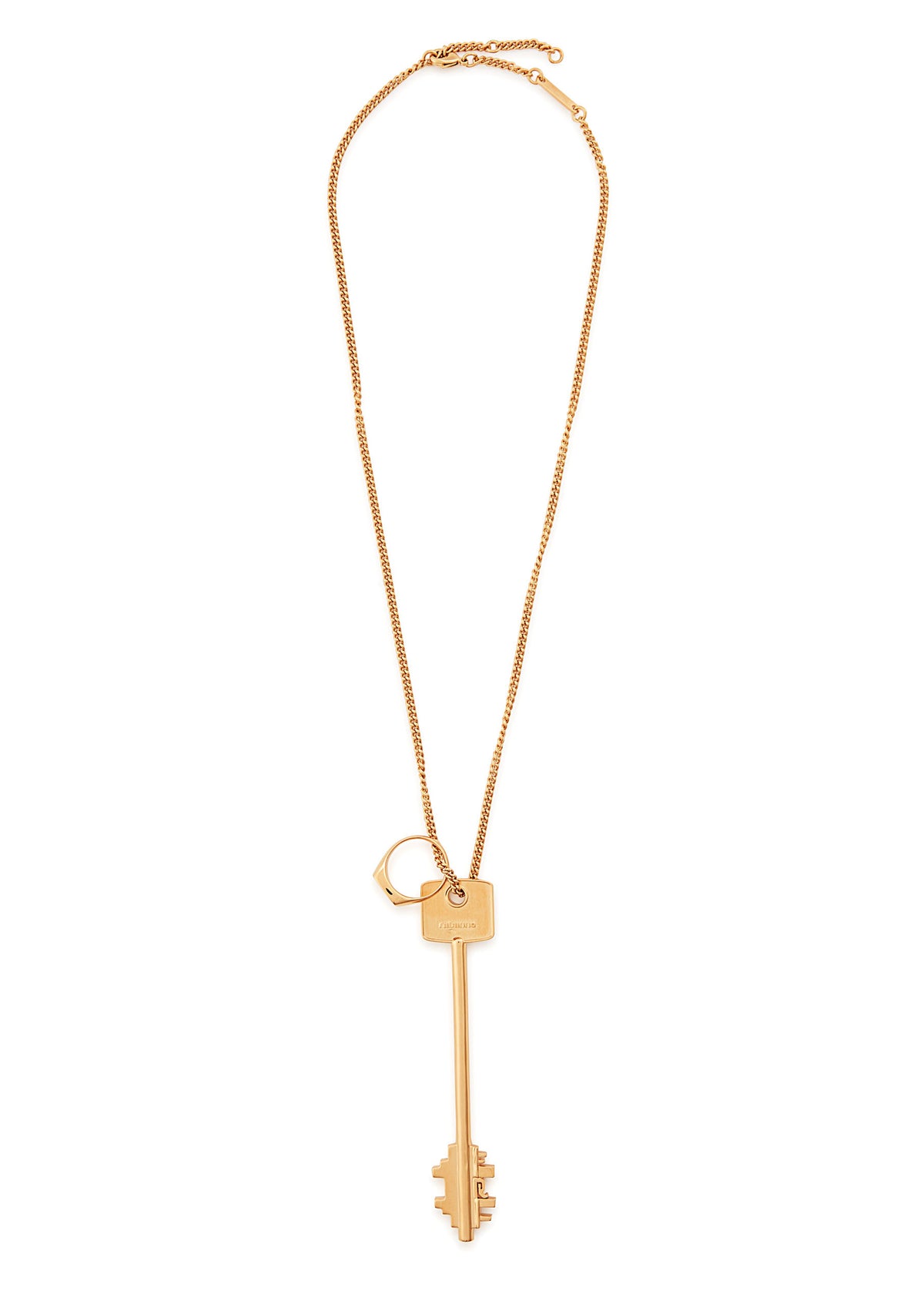This necklace is crafted from a proprietary metal with a key pendant, a detachable logo-engraved ring charm, and a designer tag. The length is 59.5cm, and it is secured with an adjustable lobster-clasp fastening. It's presented in a designer-stamped box with a pouch.