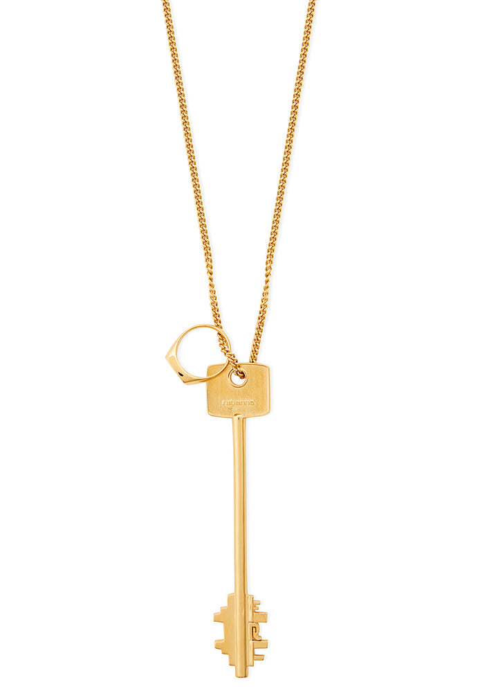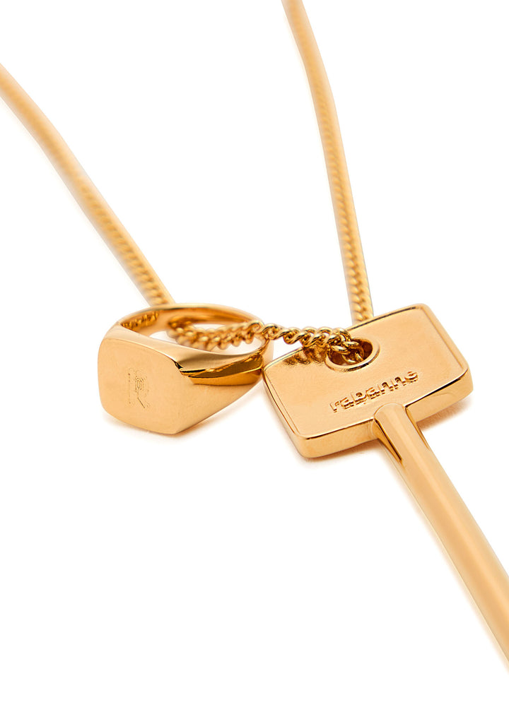 This Key necklace by Rabanne is a modern and symbolic statement piece. The necklace features a striking key pendant with a subtle logo detail and a detachable, logo-engraved ring charm. It's a versatile accessory that represents new beginnings and unlocking new styles. This piece is perfect for adding an edgy yet sophisticated touch to your look.