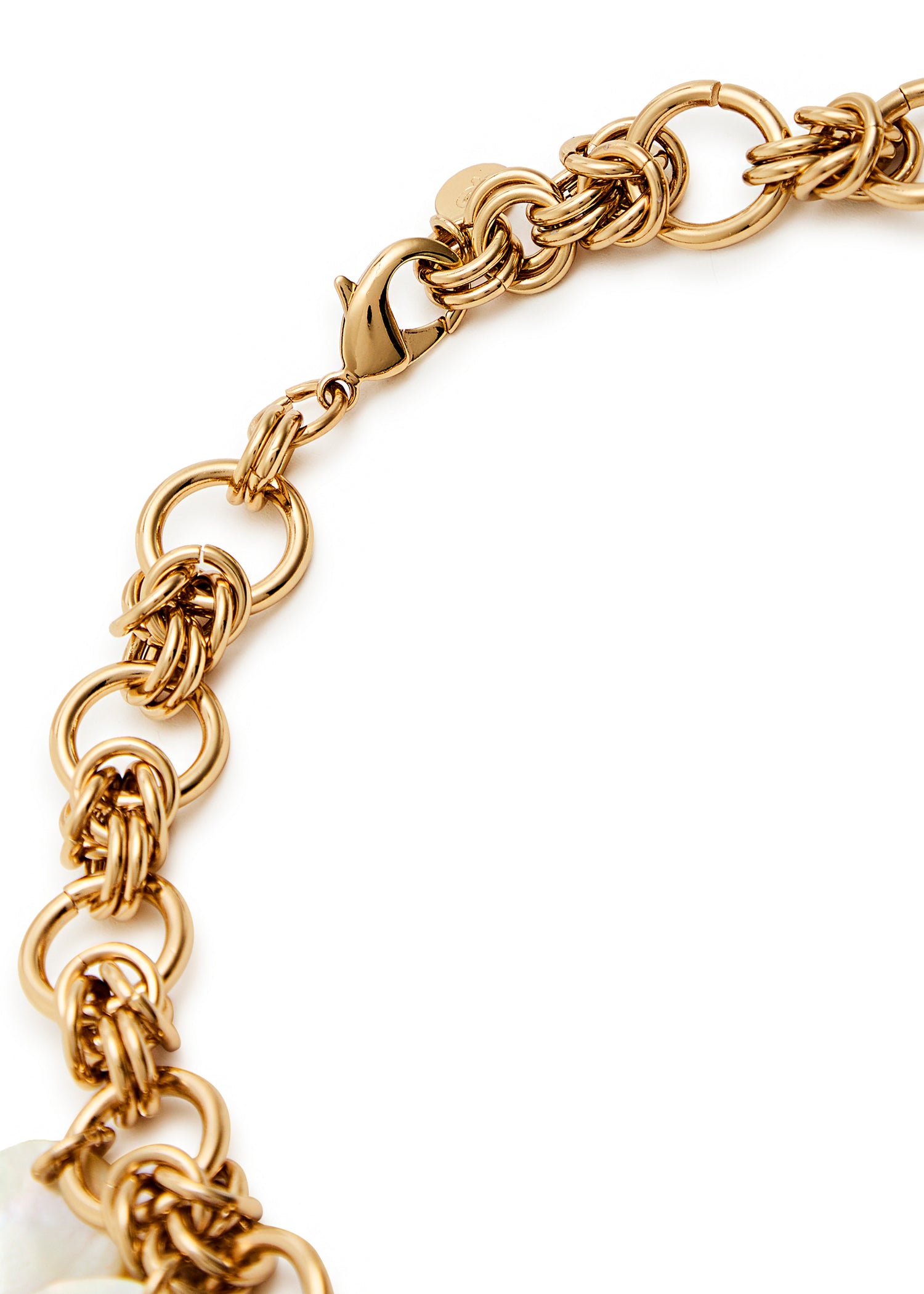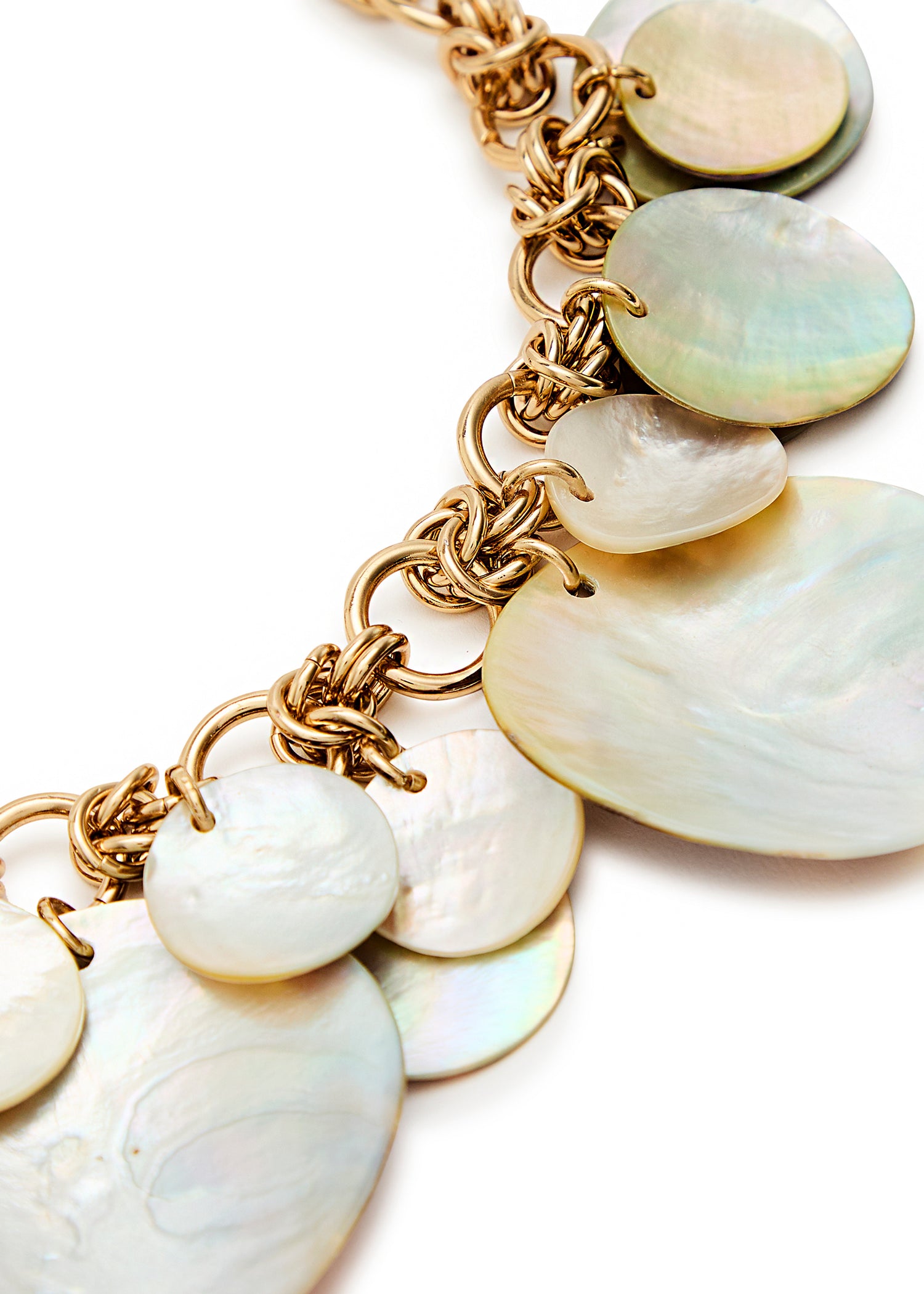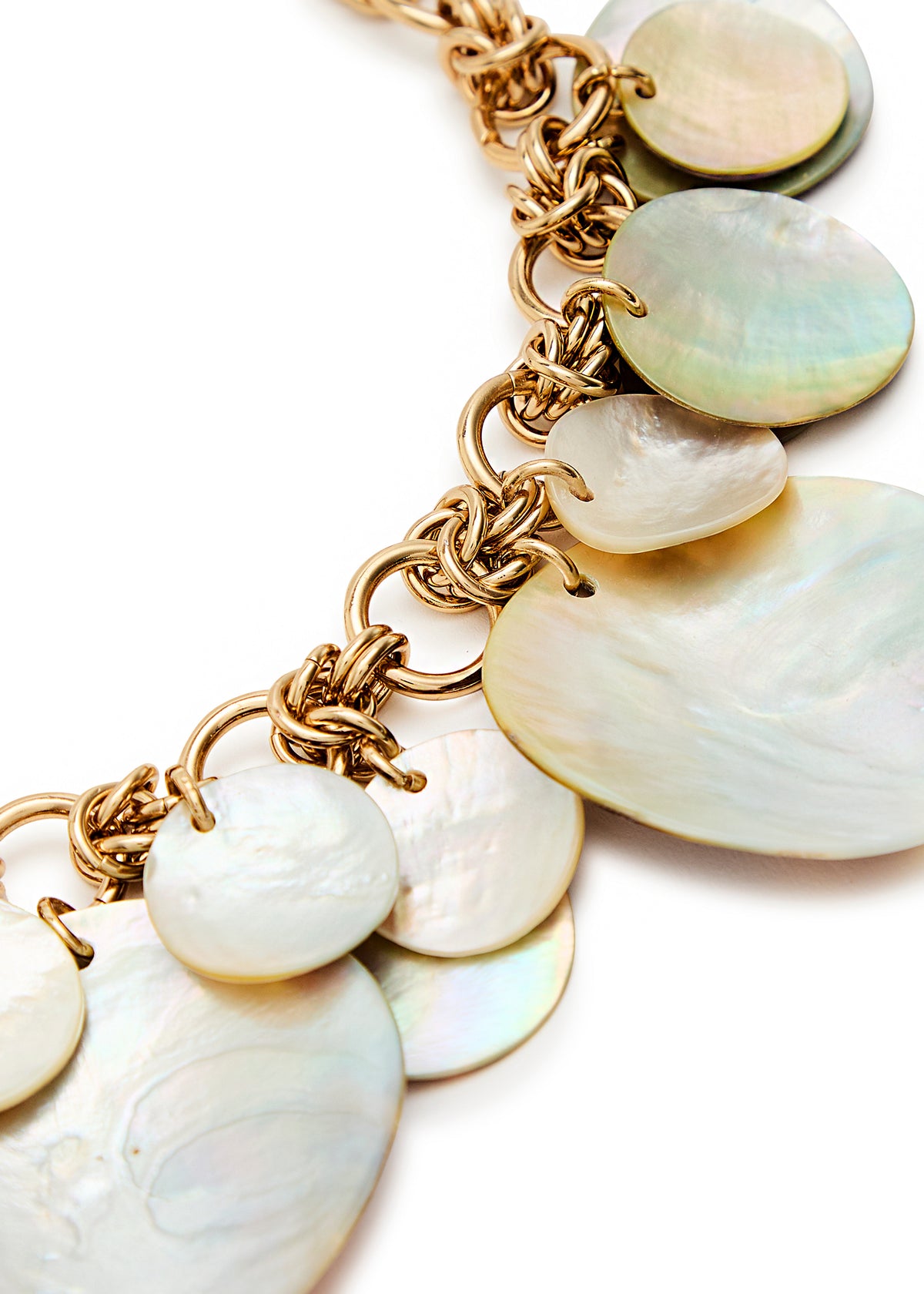 This necklace is crafted from a proprietary metal with mother-of-pearl pendants and a multi-link chain design. The length is 41cm, and it is secured with a lobster-clasp fastening. It's presented in a designer-stamped box.