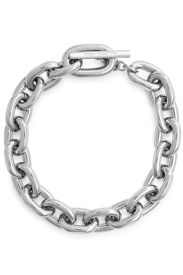 This XL Link chain necklace by Rabanne is a bold and iconic statement. The necklace features a chunky chain design, creating a sense of powerful elegance and fluid movement. The T-bar fastening adds a touch of modern artistry and security. This piece is perfect for those who want to add a touch of confident, edgy style to their neckline. It symbolizes a love for innovative design and powerful simplicity.