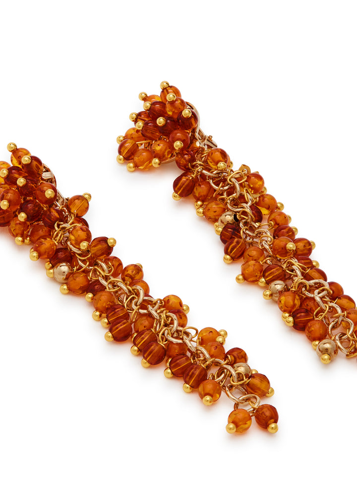 These earrings are crafted from a proprietary metal with a beaded design. The drop is 8cm, and they are secured with a clip-on fastening. They are presented in a designer-stamped pouch.