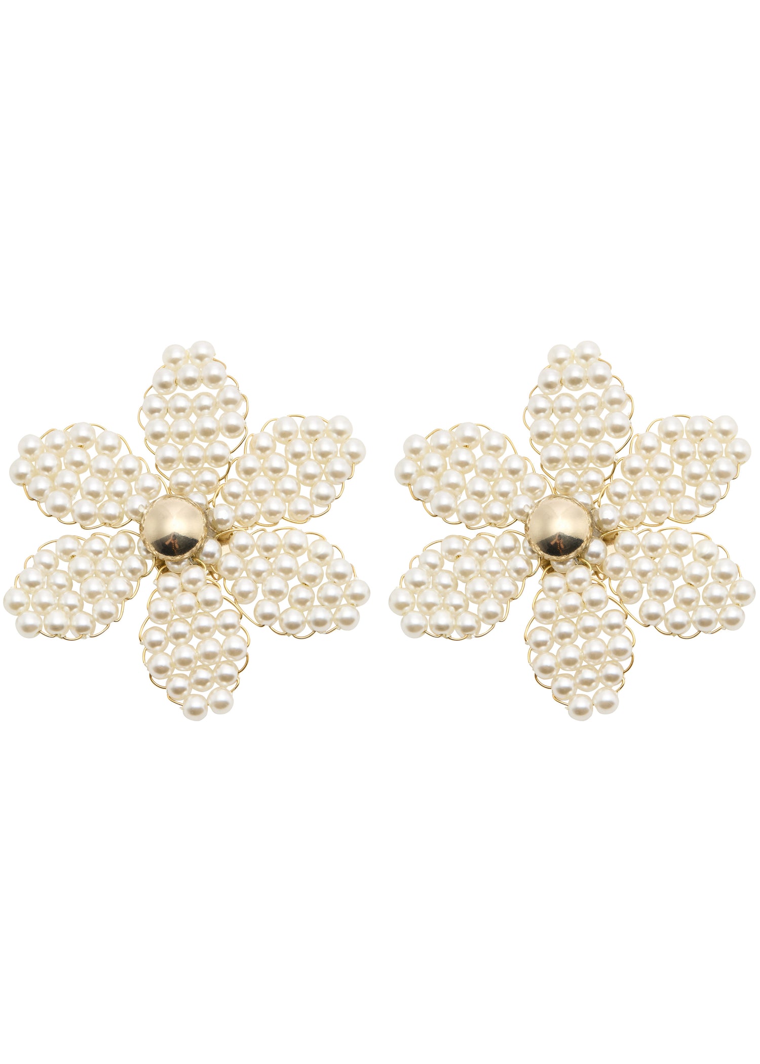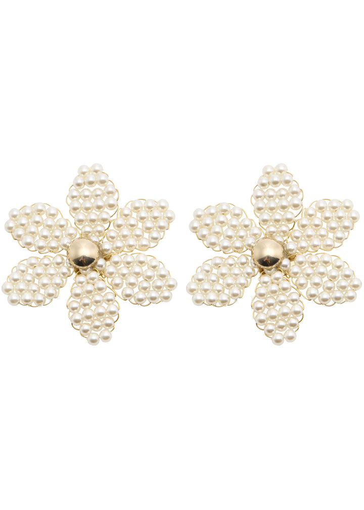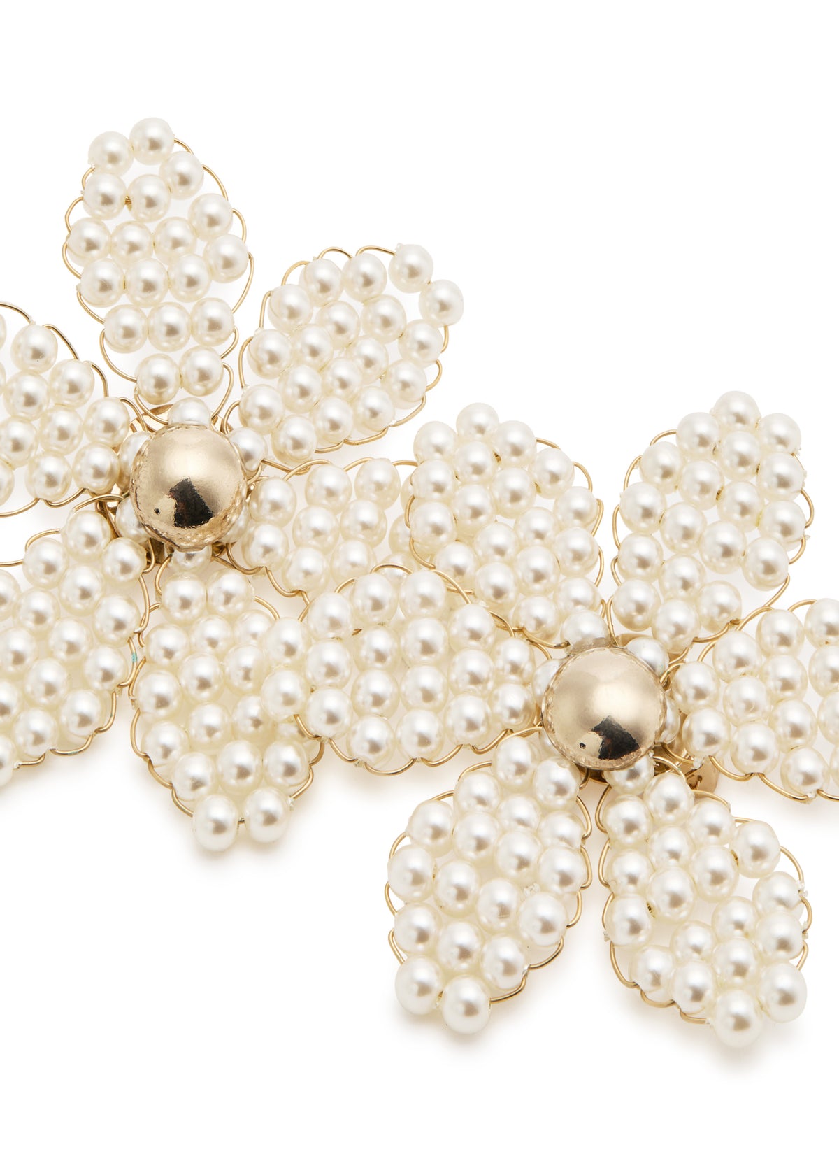 These handmade earrings are crafted with a faux-pearl beaded, floral design. The dimensions are 6cm x 6cm, and they are secured with a clip-on fastening.