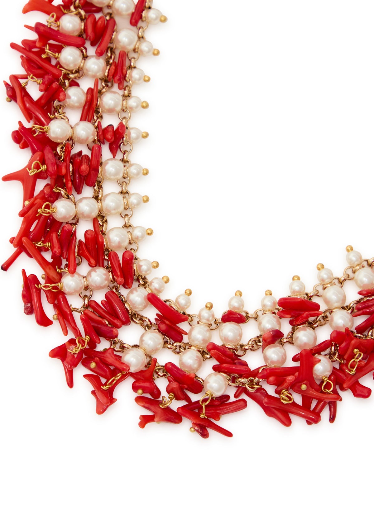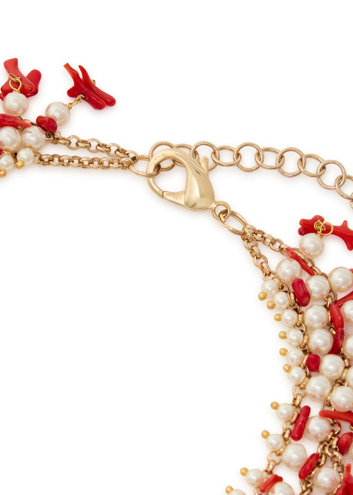 This necklace is crafted from a proprietary metal with a beaded multi-chain design and faux pearl and coral embellishments. The length is 43cm, and it is secured with an adjustable lobster-clasp fastening. It's presented in a designer-stamped pouch.