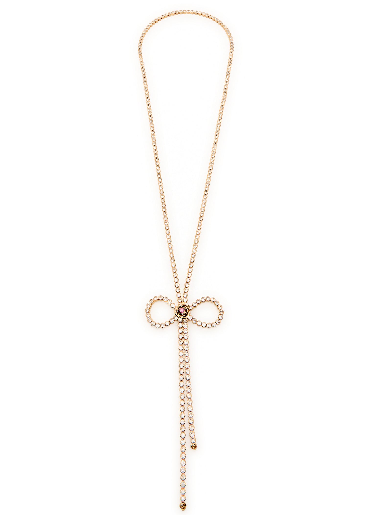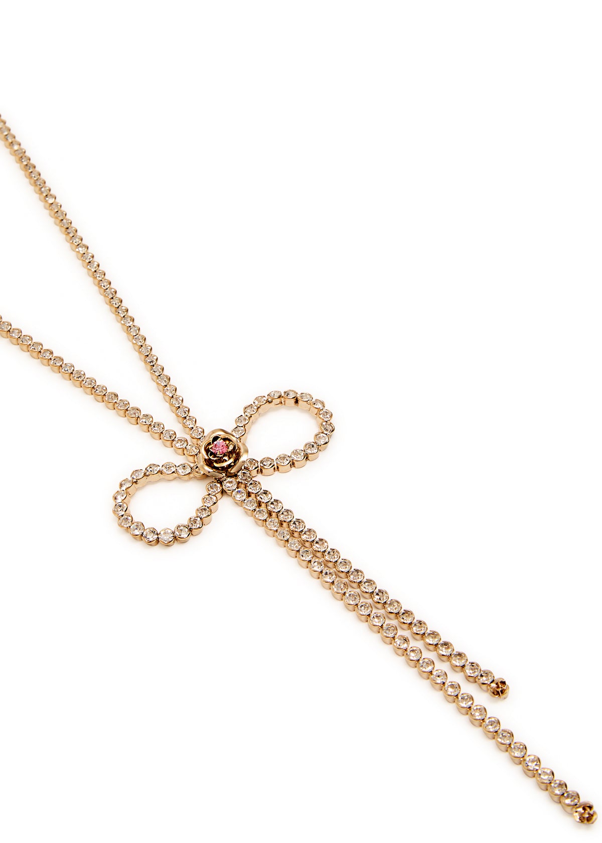 This necklace is crafted from a proprietary metal with a crystal embellished bow and a metal flower detail. The length is 50cm, the bow measures 7cm x 14cm, and it is designed to be slipped on. It's presented in a designer-stamped pouch.