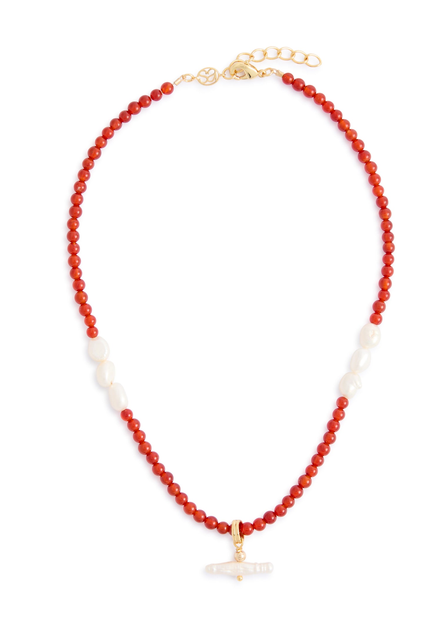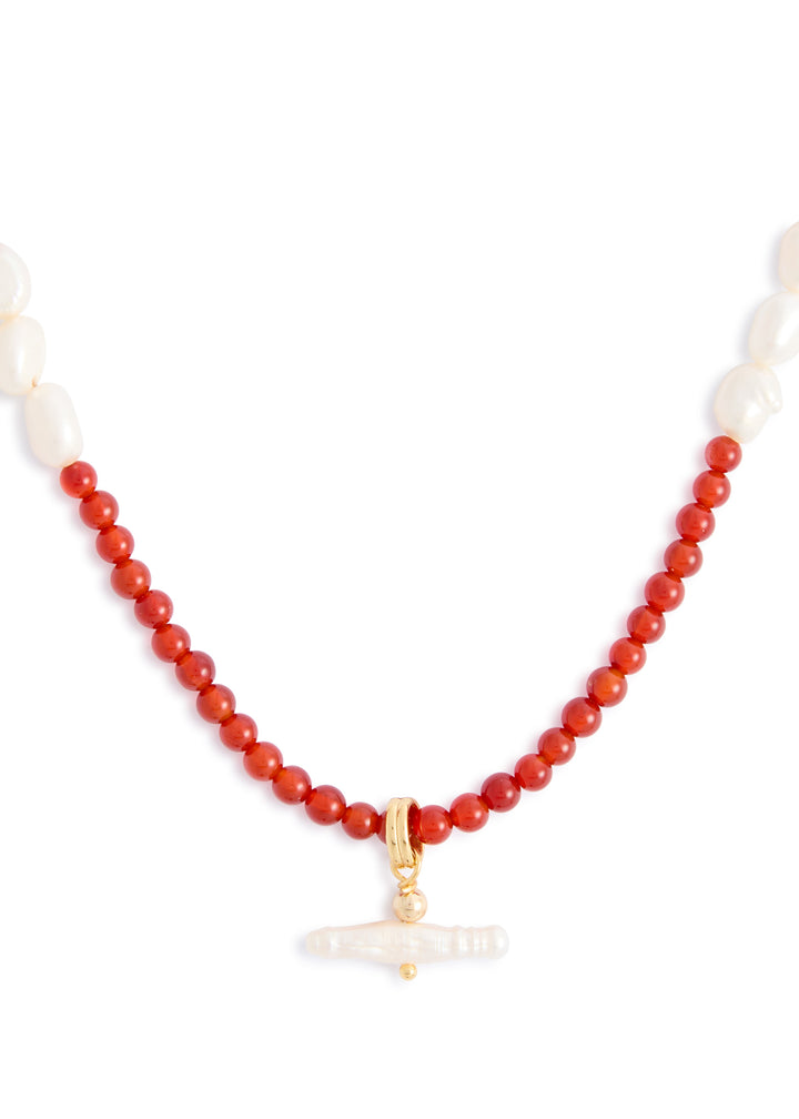This handmade necklace is crafted with a pearl and stone beaded chain and an 18kt gold-plated brass finish. The pendant is a pearl T-bar. The adjustable length is 39cm - 42.5cm, and the pendant drop is 1.5cm. It is secured with a lobster clasp fastening.