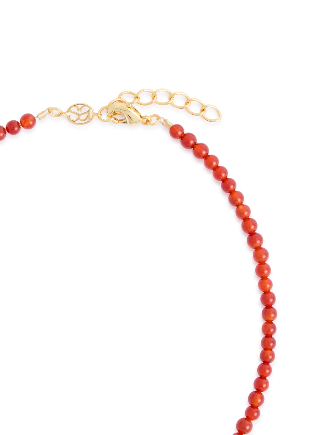 This Pearl T-bar and stone 18kt gold-plated necklace by Sandraalexandra is a unique and artistic statement. The handmade necklace features a beautiful display of pearl and stone beads with a stunning pearl T-bar pendant. This creates a sense of fluid movement and modern artistry, perfect for adding a touch of confident, free-spirited style to your neckline.
