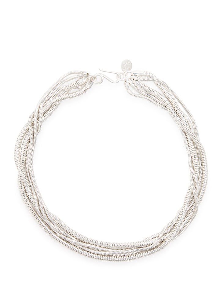 Made of silver with a multi-chain design, this choker is 38cm long and has a hook-clasp fastening. It's presented in a designer-stamped box with a pouch.