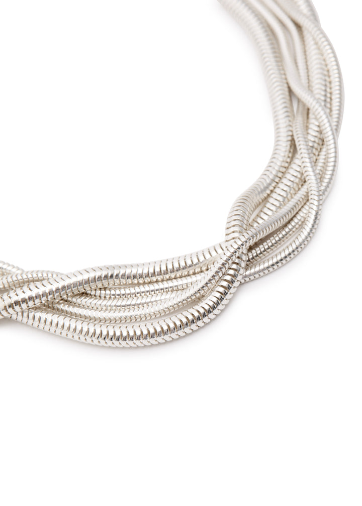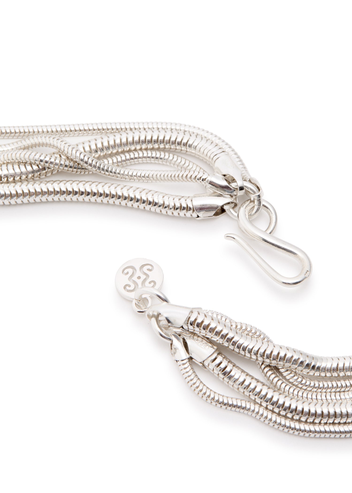This Multi-snake sterling silver choker is a bold and striking statement piece. It features a multi-chain design that resembles multiple snakes, creating a sense of powerful elegance and fluid movement. This piece is perfect for adding an edgy yet sophisticated touch to your neckline, whether worn alone or layered with other chains.