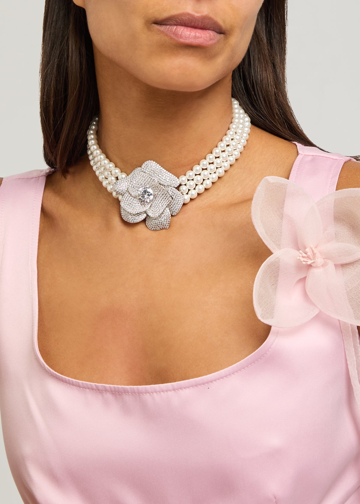 Crafted from silver-plated brass, this choker features layered faux pearls and a crystal-embellished flower pendant. It has an adjustable lobster-clasp fastening. The length is 41cm, and the pendant measures 5cm x 5cm.