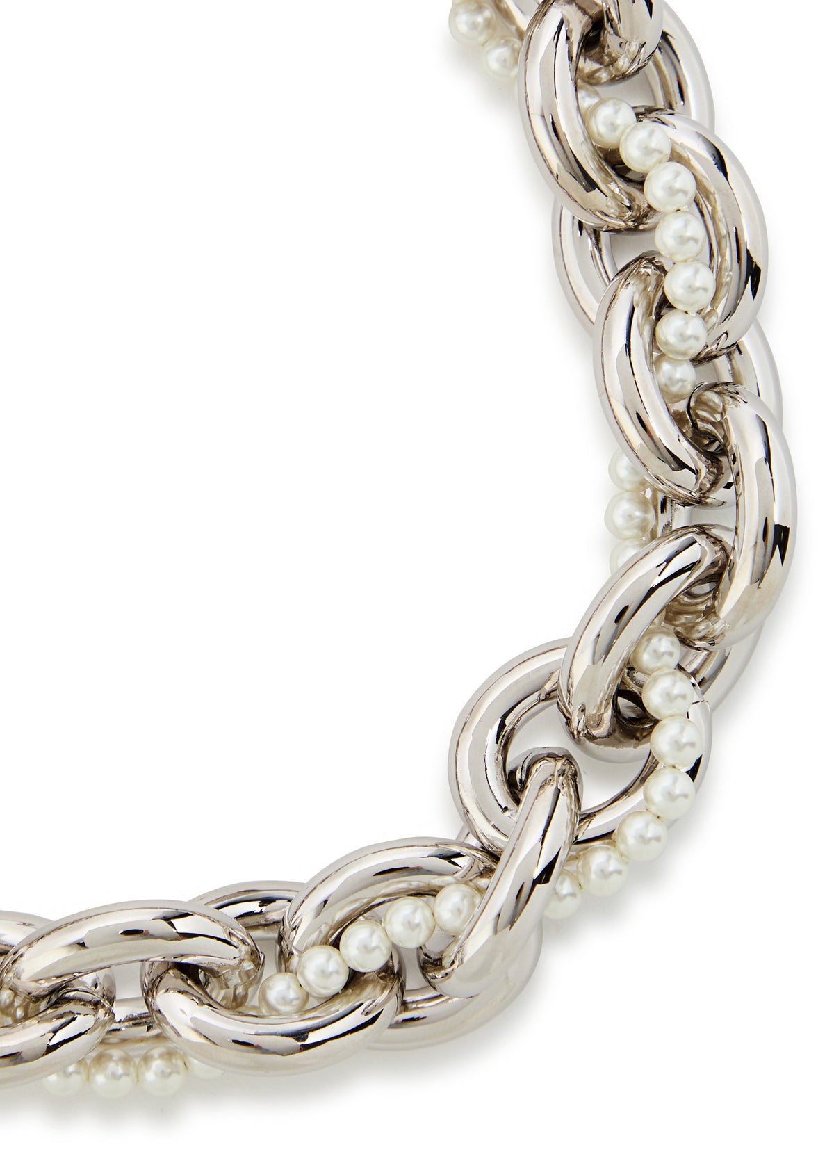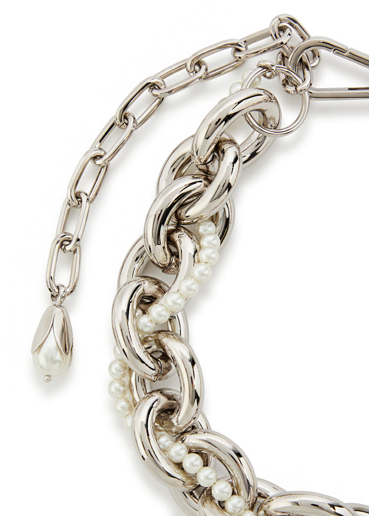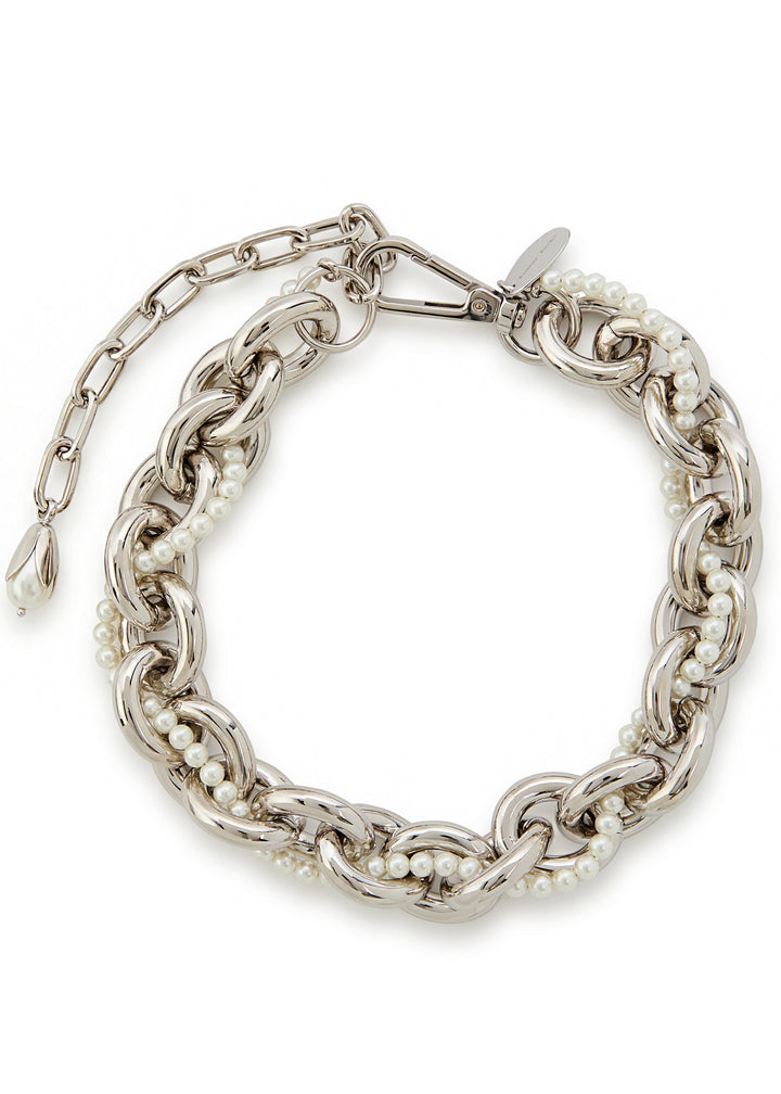 This necklace is crafted from metal with a chunky chain design and woven faux pearl details. It features an adjustable lobster-clasp fastening with an engraved designer tag. The length is adjustable from 40cm to 52cm.