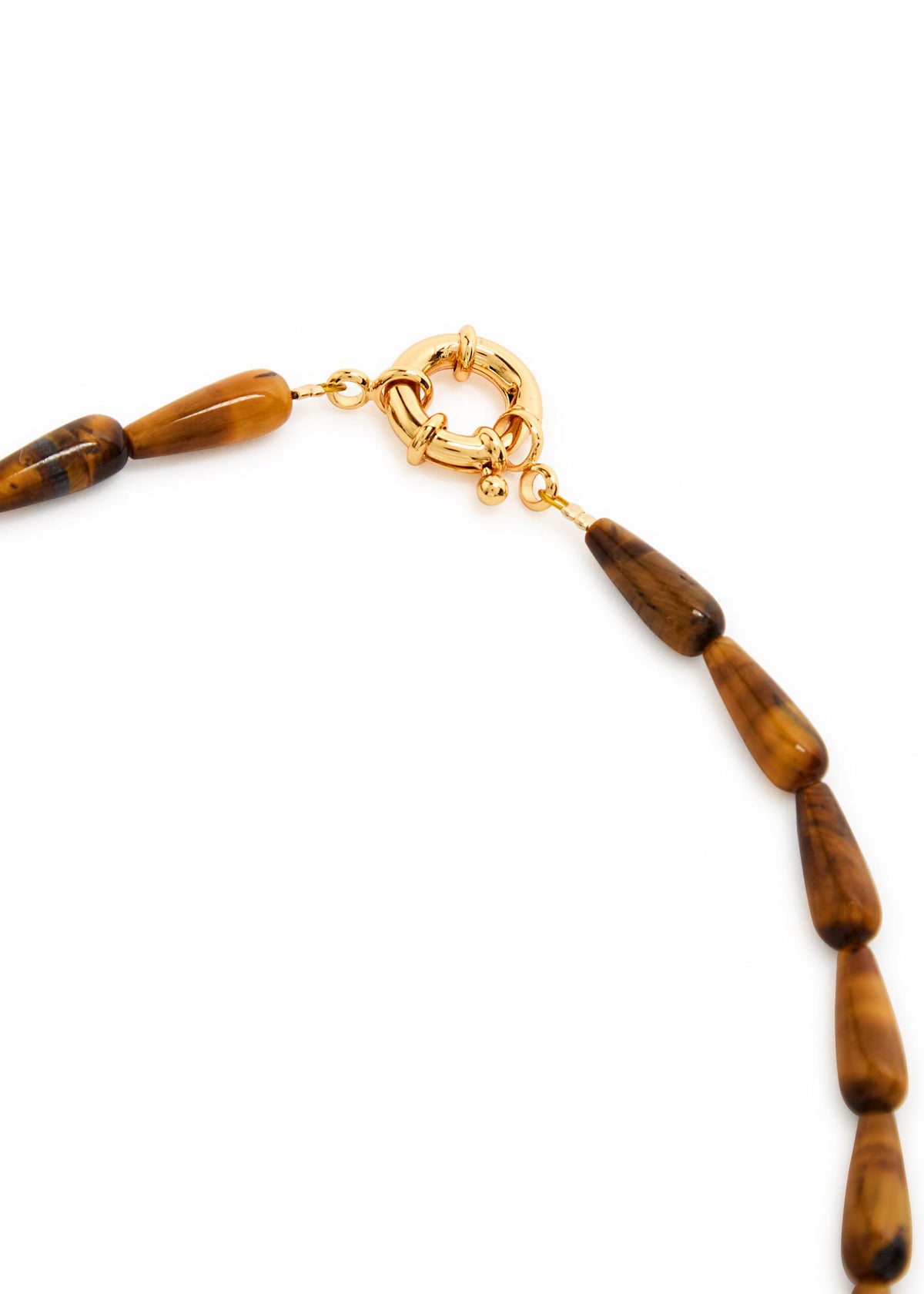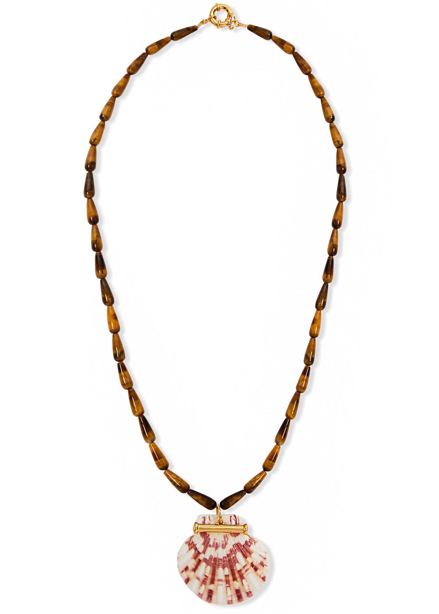 This handmade necklace is crafted from 24kt gold-plated brass with tiger eye beads and a shell pendant. It has a ring-clasp fastening. The length is 65cm, and the pendant measures 5.5cm x 5cm.