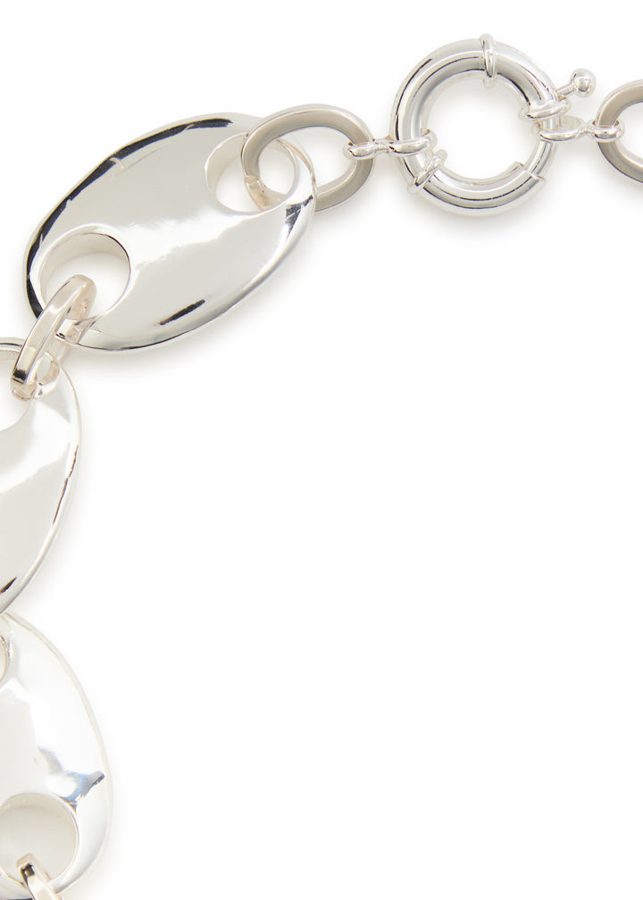 This handmade necklace is crafted from sterling silver with a chai link design and coffee bean charms. It has a clasp fastening and a length of 39.5cm.