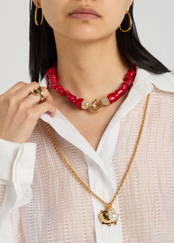 This handmade necklace is crafted from 24kt gold-plated brass with coral beads and crystal embellishments. It features a hook fastening, with a length of 41cm.