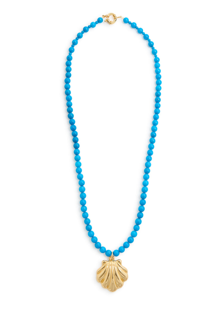 Handmade from 24kt gold-plated brass, this necklace features howlite beads and a sculpted shell pendant. It has a clasp fastening with a length of 70cm.