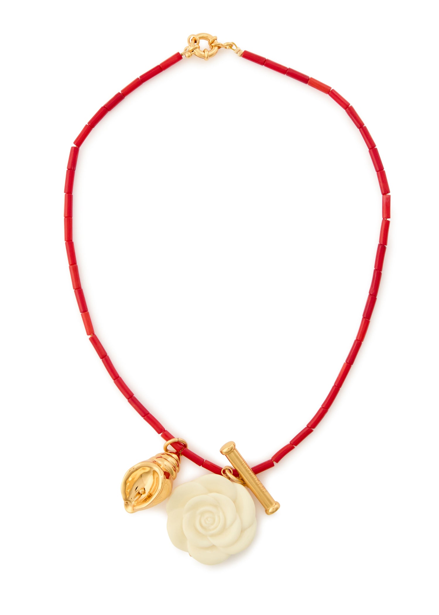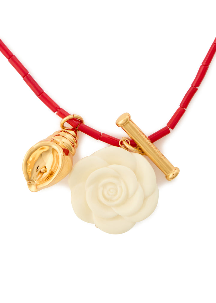 This handmade necklace is crafted with beads, a 24kt gold-plated brass T-bar charm, and an enamelled floral pendant with sculpted details. It features a ring-clasp fastening with a length of 42cm and a pendant measuring 3cm x 3.5cm.