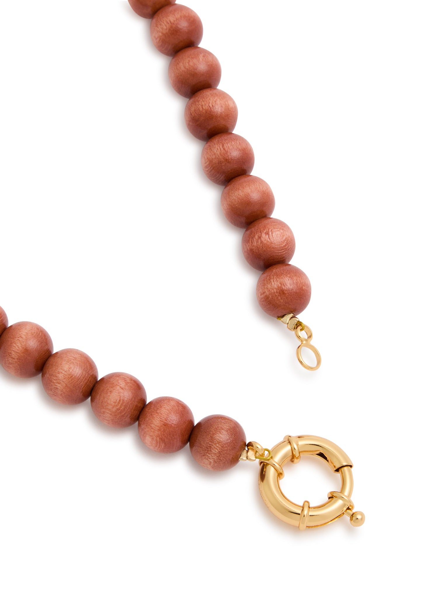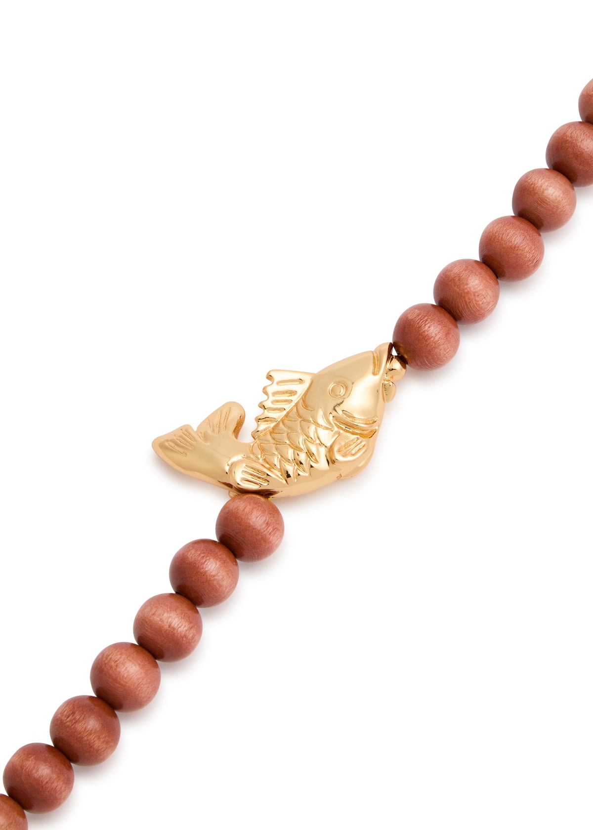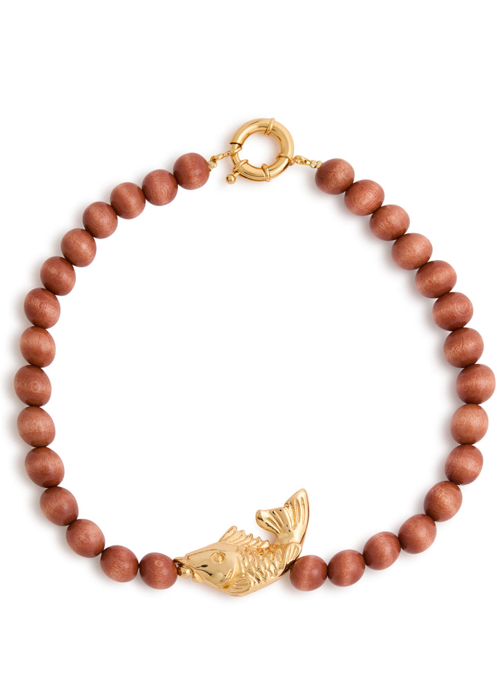 This handmade necklace is crafted with wooden beads, a 24kt gold-plated fish pendant, and 24kt gold-plated hardware. It has a lobster-clasp fastening, with a length of 43cm and a fish charm measuring 5cm x 2.5cm.