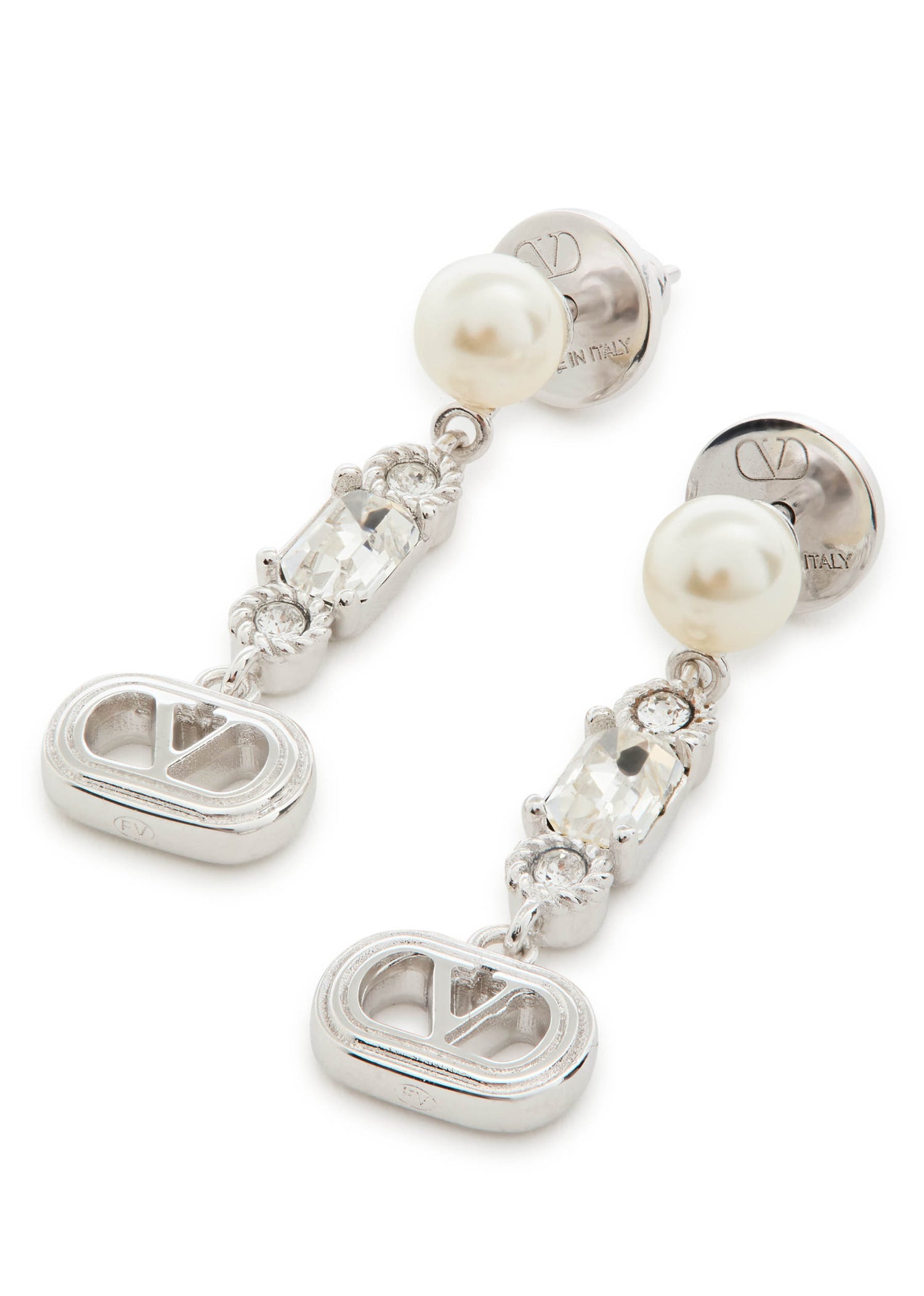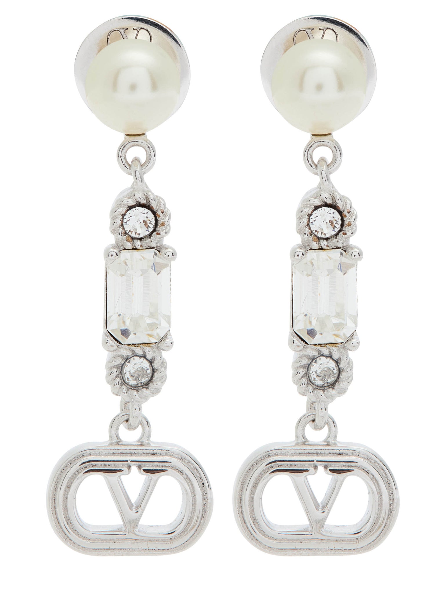 These Valentino Garavani metal drop earrings feature faux pearl and Swarovski crystal embellishments and a VLogo charm. They have a post fastening for pierced ears, with a drop of 3cm.