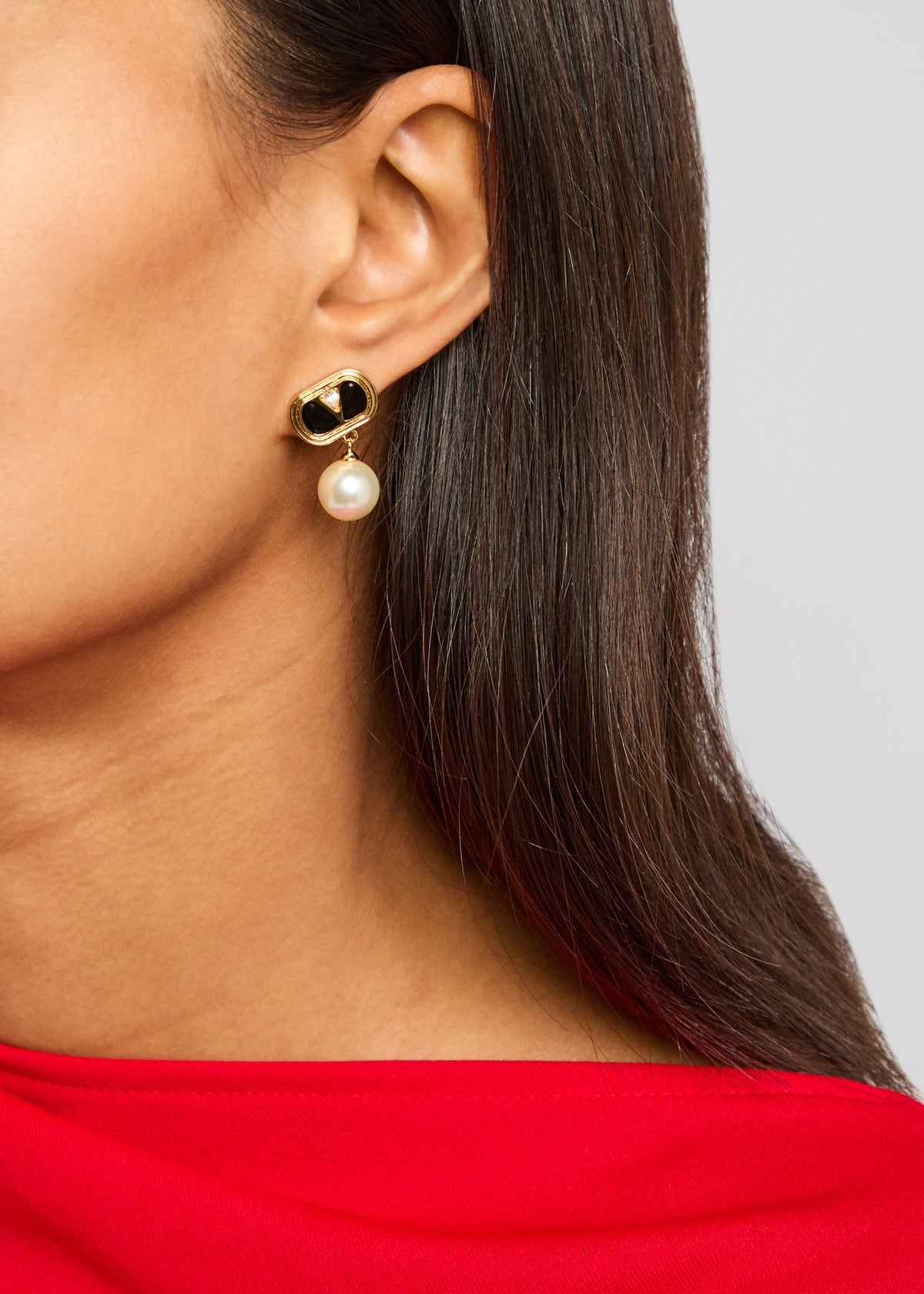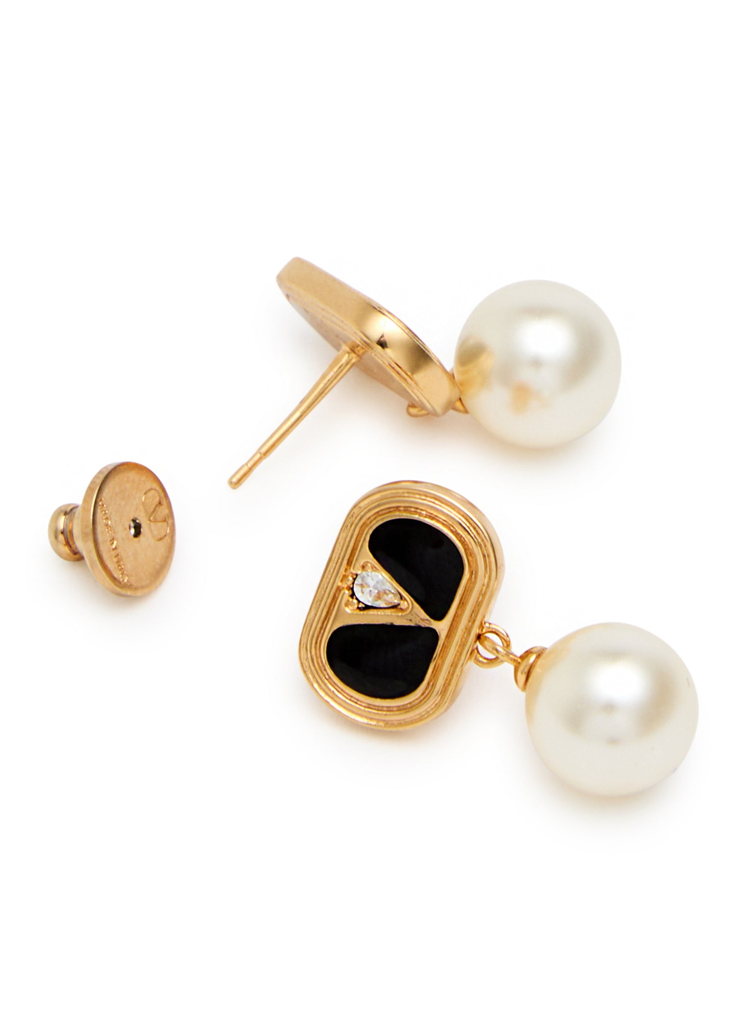 These Valentino Garavani metal drop earrings feature an enamelled stud, a VLogo plaque, crystal embellishment, and a Swarovski faux pearl pendant. They have a post fastening for pierced ears, with a drop of 1.6cm.