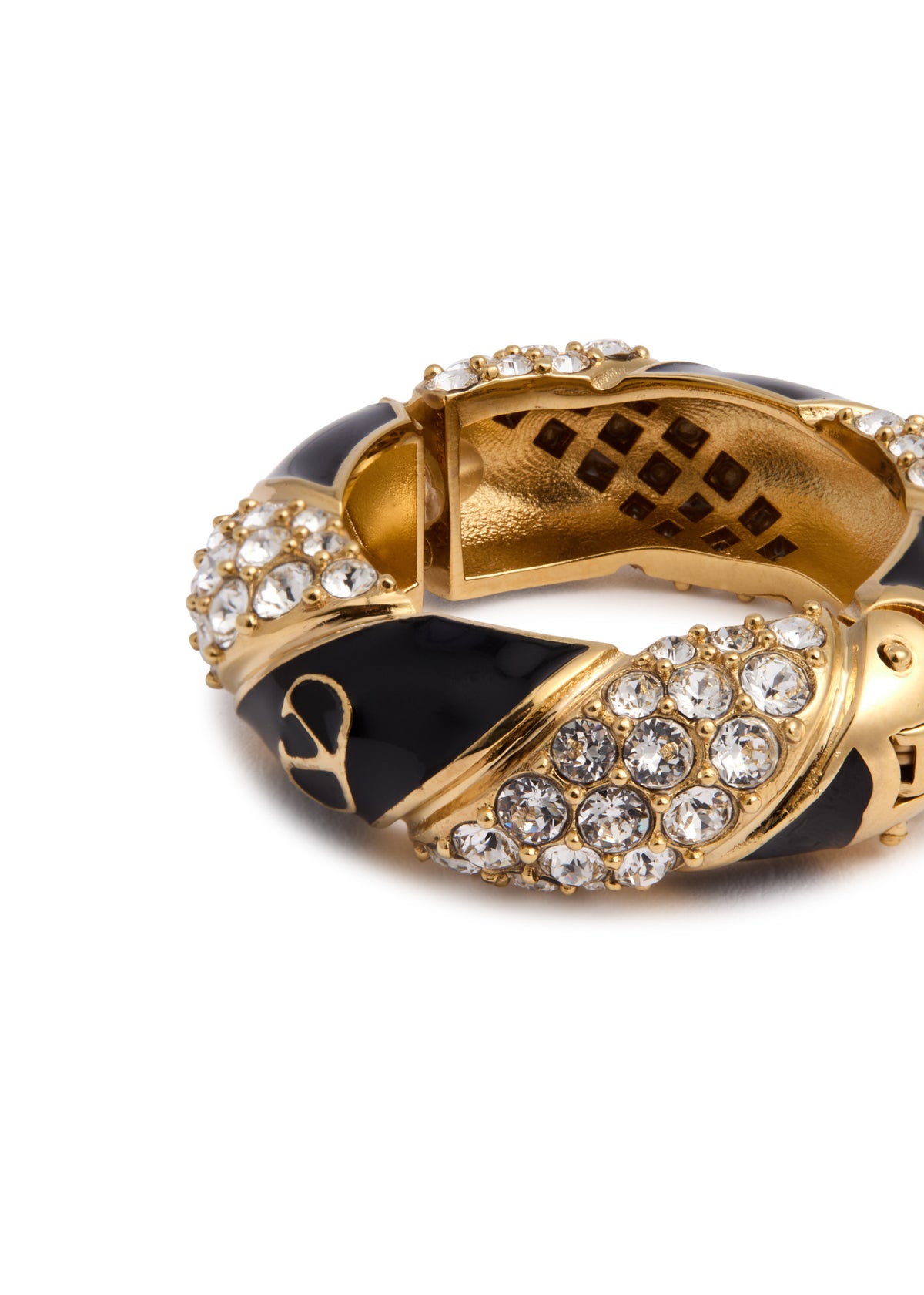 This Large crystal-embellished ear cuff by Valentino Garavani is a statement of high-fashion audacity. Its substantial size and bold design, featuring striking enamel inserts and sparkling Swarovski crystal embellishments, create a luxurious and commanding presence. This piece embodies a confident and avant-garde aesthetic, perfect for those who want to make a powerful style statement.