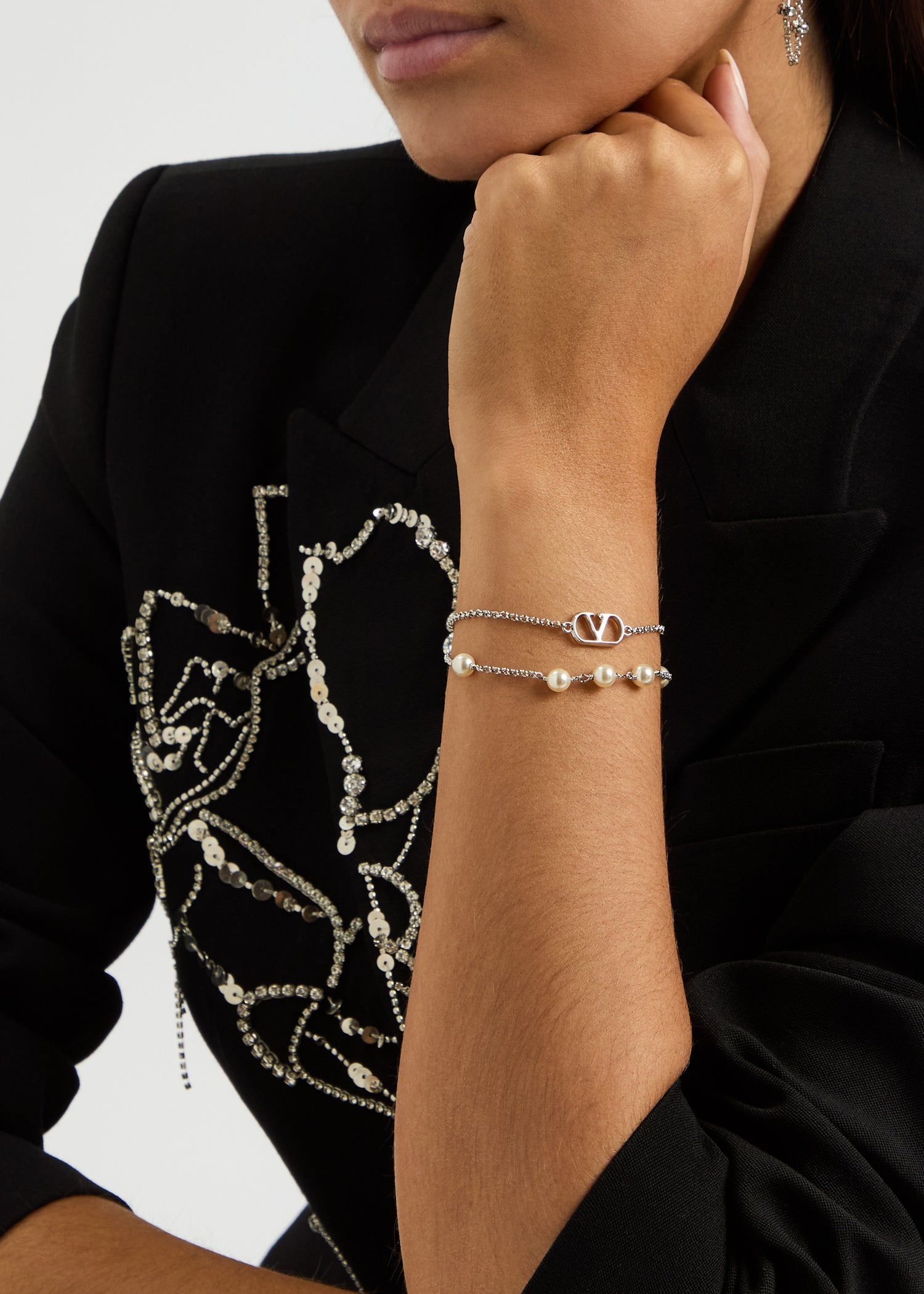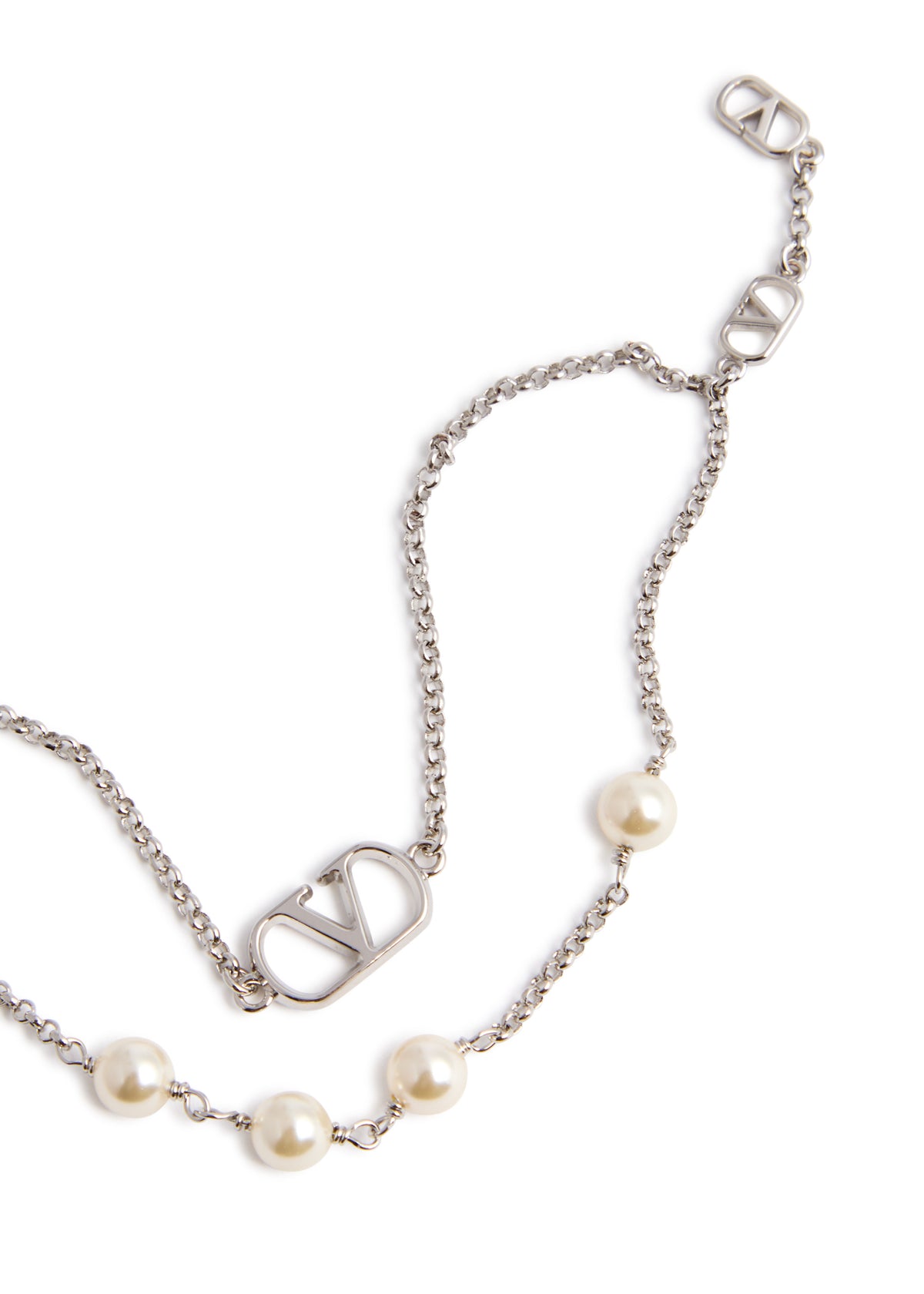 This Valentino Garavani chain bracelet is double-layered and features Vlogo plaque charms and Swarovski pearl embellishments. It has an adjustable lobster-clasp fastening, with a length of 18cm.