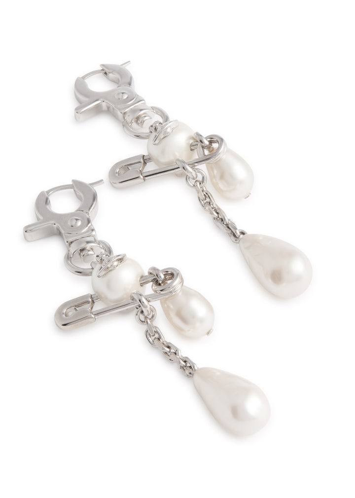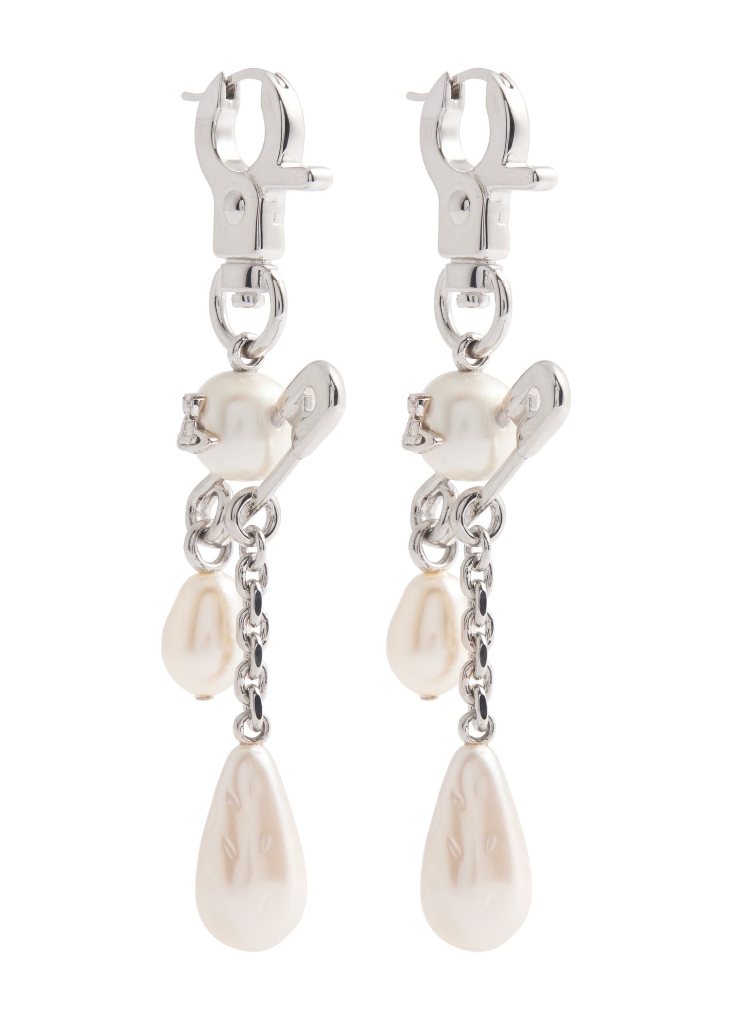 These Vivienne Westwood drop earrings feature a lobster clasp, safety pin detail, pearl embellishments, and an Orb plaque. They have a sleeper-fastening for pierced ears, with a drop of 8cm.