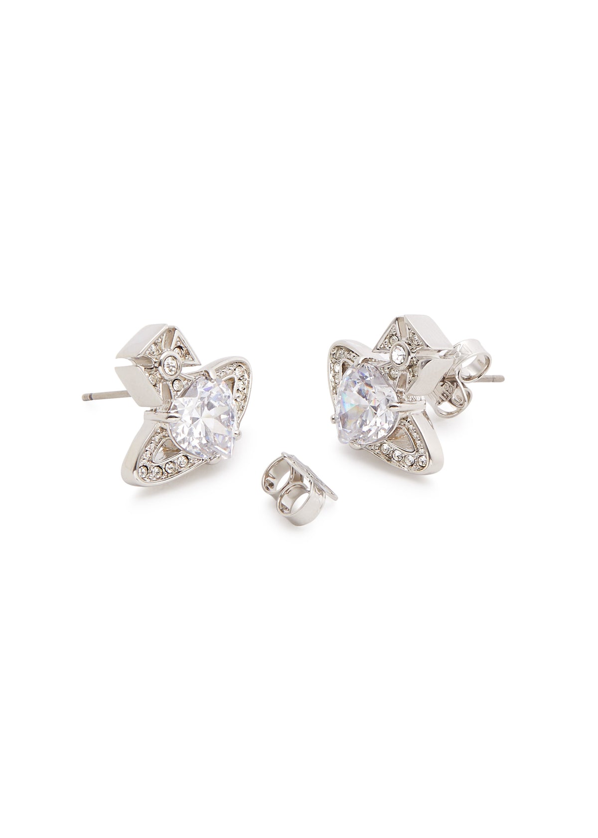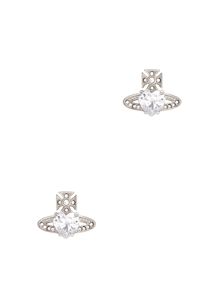 These Vivienne Westwood stud earrings feature a signature orb design with pavé crystal embellishments and a heart-shaped Swarovski crystal embellishment. They have a butterfly fastening for pierced ears, and measure 1.5cm x 2cm.