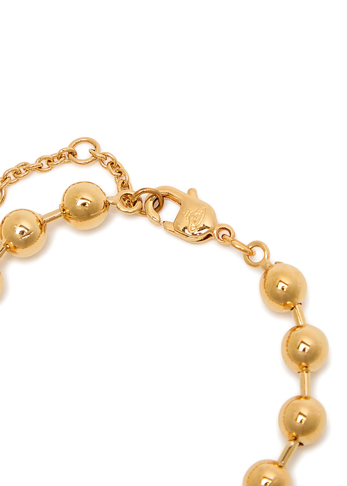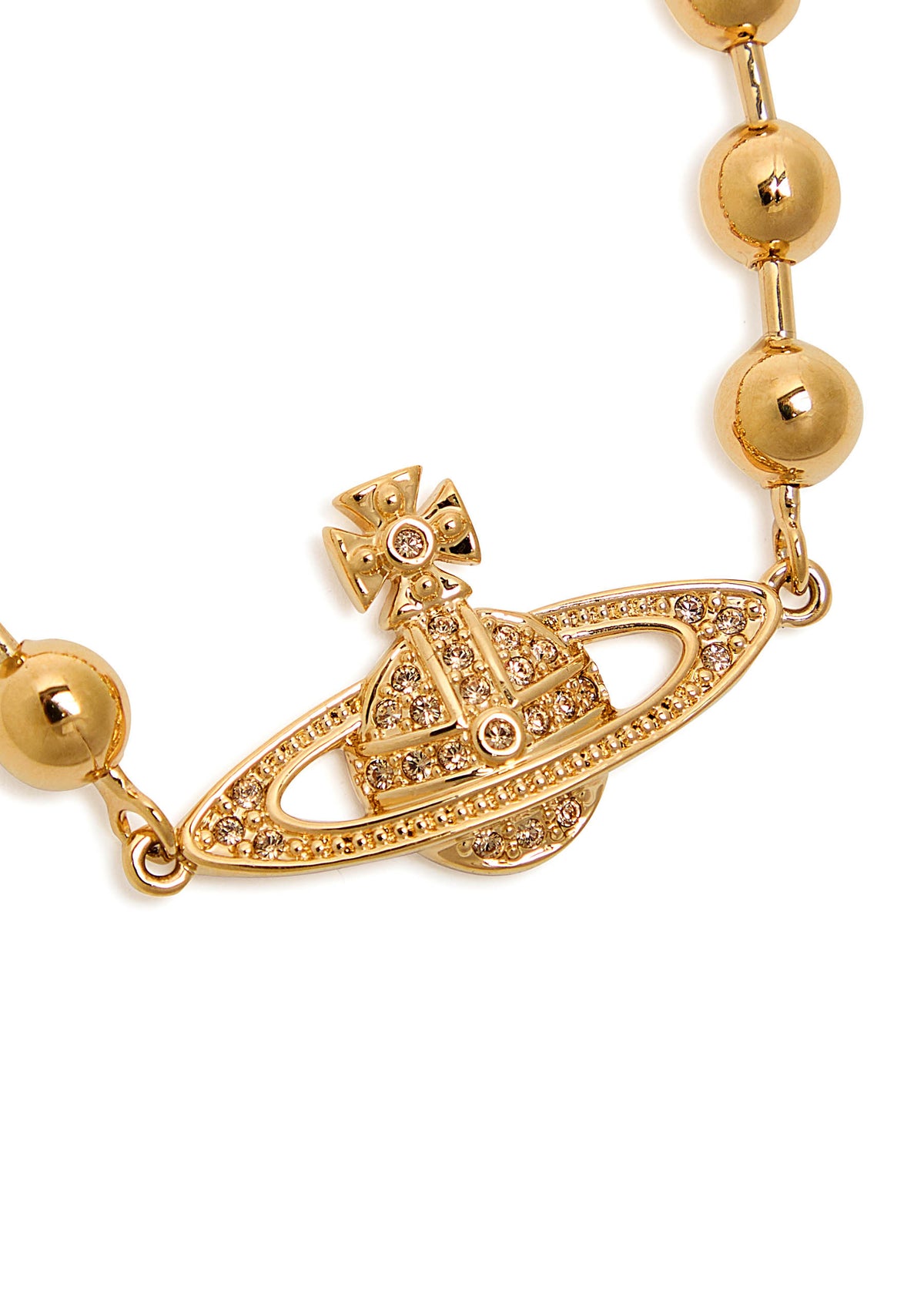 This hand-finished Vivienne Westwood metal bracelet features a beaded chain design, a textured signature orb pendant, and crystal embellishments. It has an adjustable lobster-clasp fastening and a length of 18.5cm.