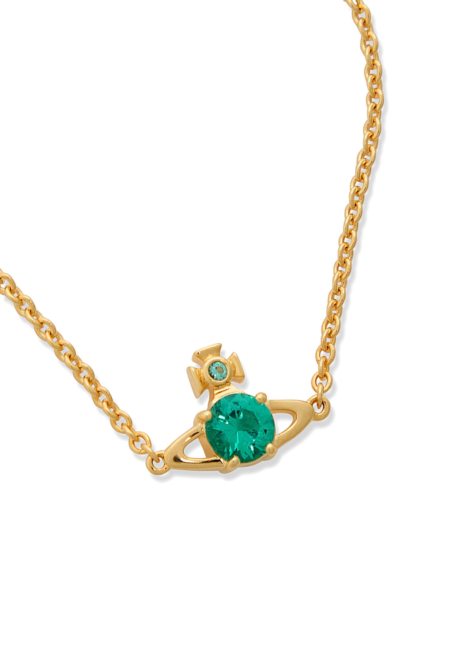 This Reina small orb bracelet by Vivienne Westwood is a subtle yet iconic accessory. The signature Orb pendant, adorned with brilliant crystal embellishments, creates a piece that is both timeless and eye-catching. The pop of green adds a unique and vibrant touch, making it a perfect statement piece.