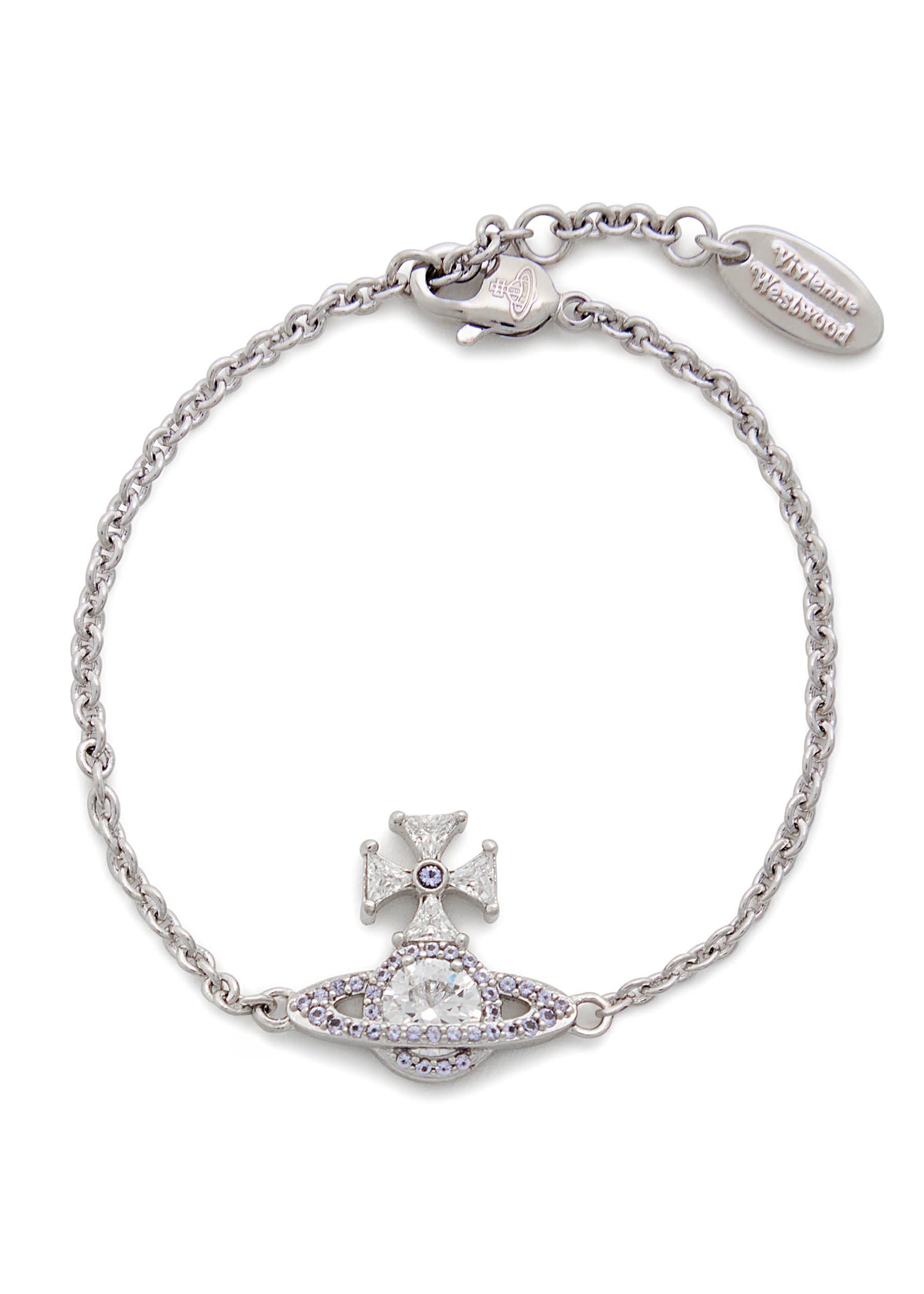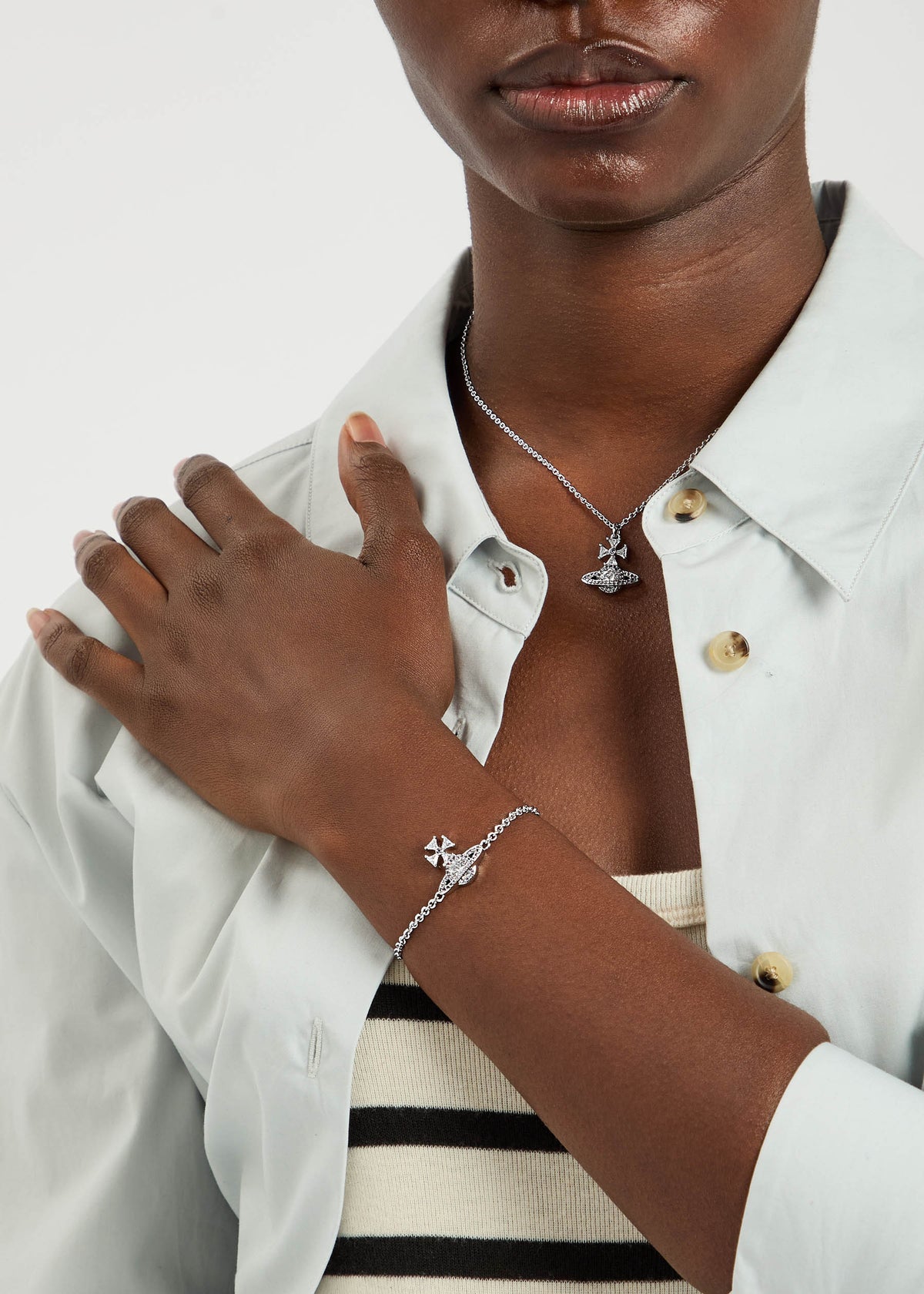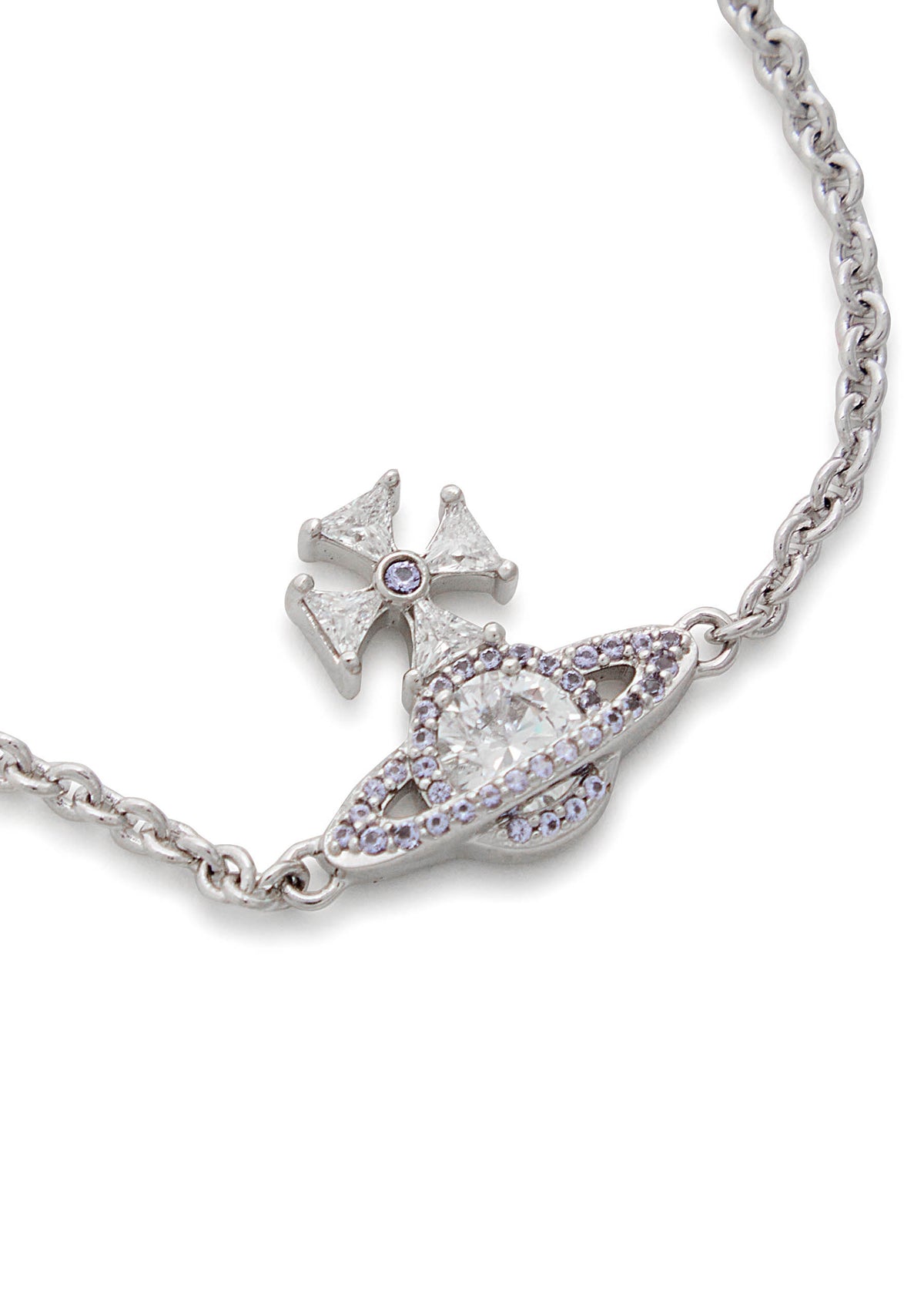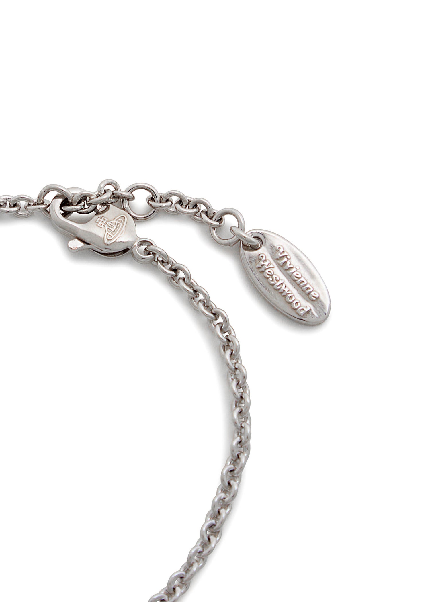 This hand-finished Vivienne Westwood metal bracelet features a signature orb design with crystal embellishments. It has an adjustable lobster-clasp fastening and a length of 16.5cm.